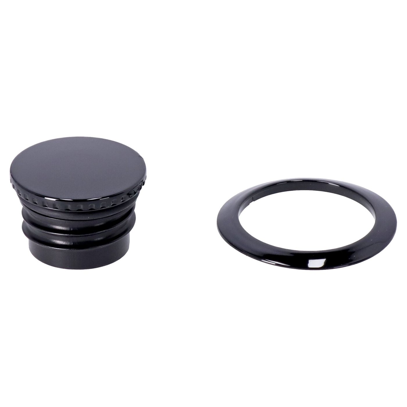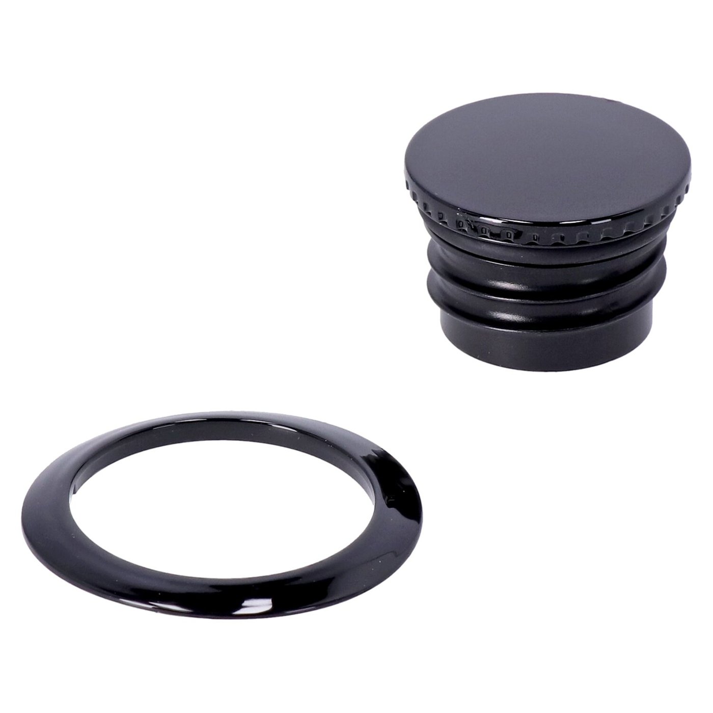 Low profile pop-up design, to replace the standard screw-in fuel cap. Installs with a screw-in insert that mounts in the tank. In this the pop-up gas cap is installed to allow a flush mount, super low profile. The trim ring is self-adhesive and give the finished touch. To open cap, just push for the filler cap to come up and screw filler cap open. Gives a good grip so works with or without gloves. Set includes insert, gas cap and trim ring.