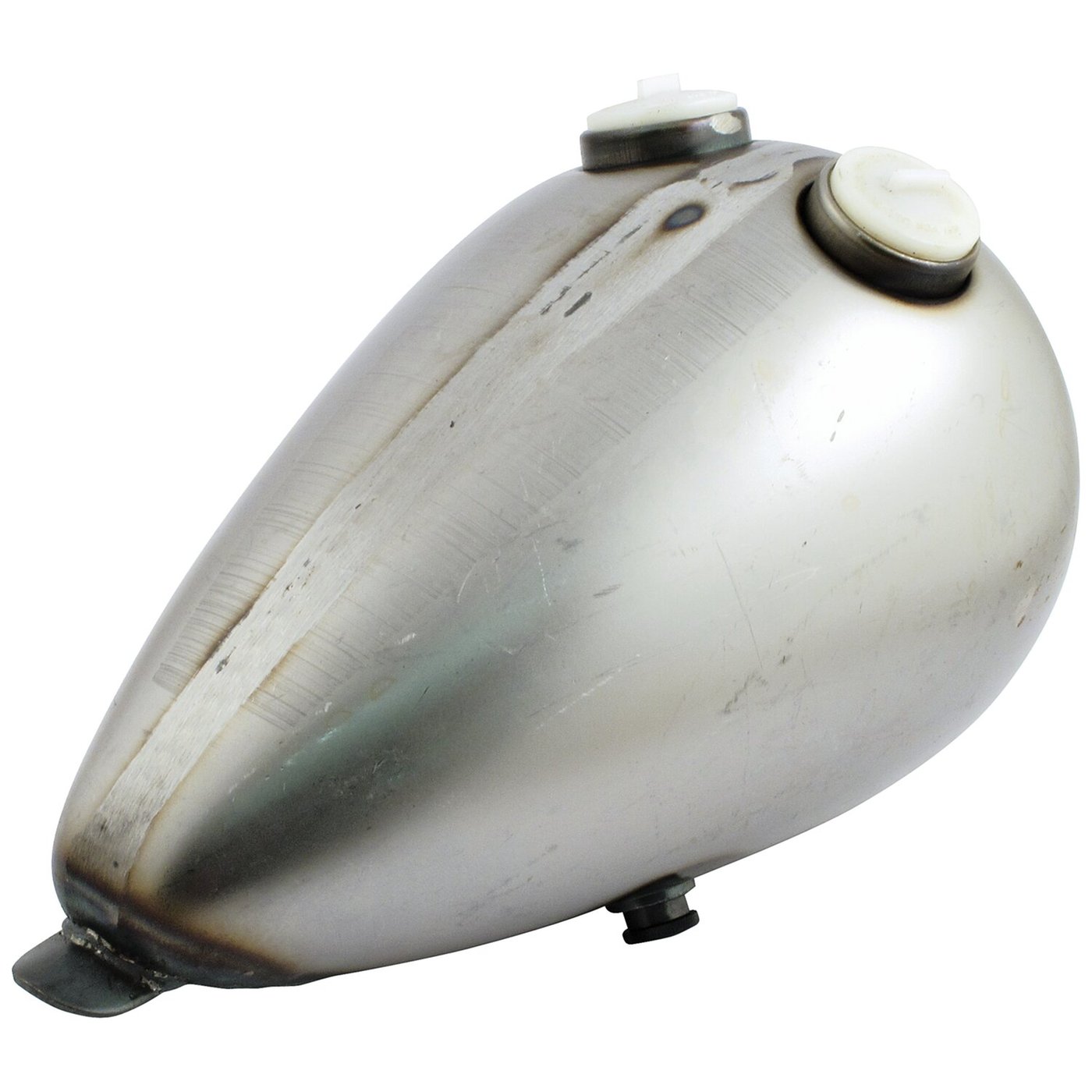 2.2 gallon (8.3 liter). Small custom fuel tank. Tank comes with internal thread, 3/8″ (right side) and 1/4″ thread (left side). Takes pre-83 bajonet style gas caps. Approx. dimensions: 17″ (43cm) long x 9″ (23cm) wide with a 3″ (7.6cm) deep tunnel. Note: When using a 3/8″ petcock, the 1/4″ hole must be sealed with a plug. This 1/4″ plug is not included and must be purchased separately. Note: It is advised to pressure test, seal and test fit all tanks before tanks are painted and installed. Some tanks are painted, but this coat is applied for rust prevention during storage only.