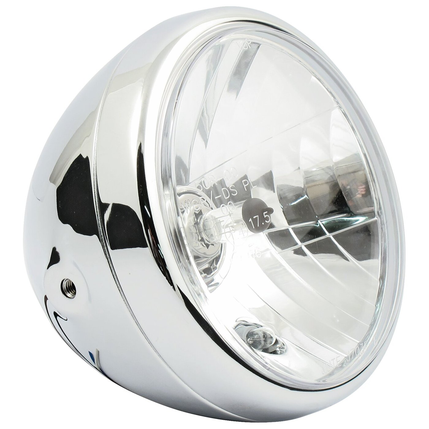 – Chrome, without LED halo ring – M8 threaded side mount – ECE approved – 55/60W H4 unit with position light – Clear lens – Prismic reflector – Approx. housing dimensions 190mm dia. x 160mm long