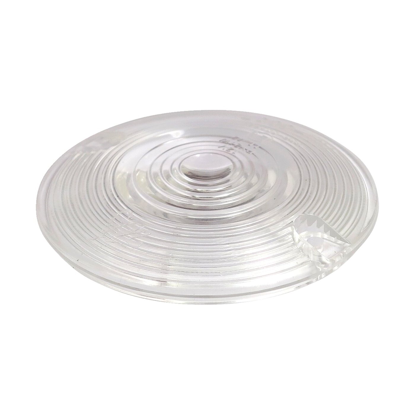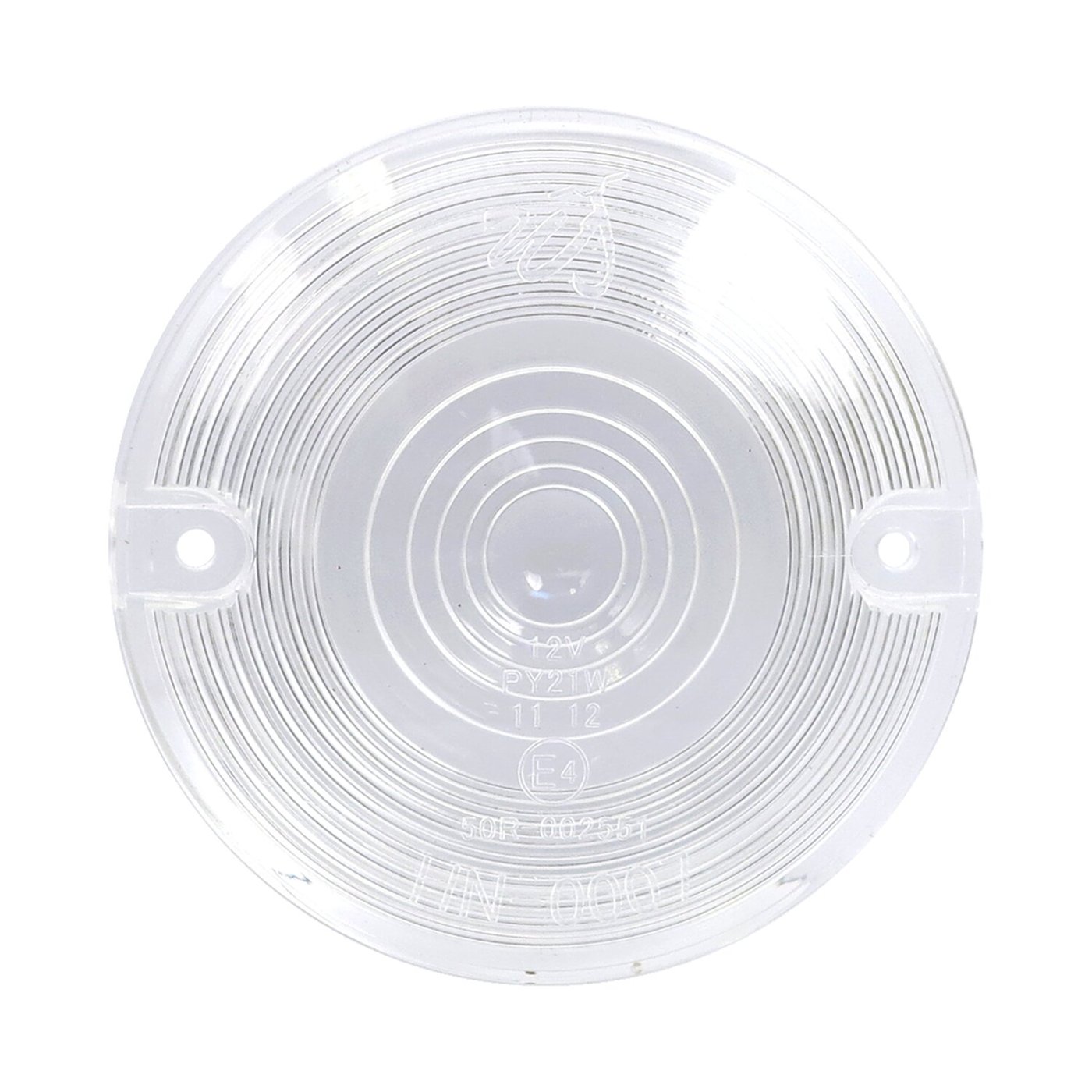 – Clear – Screw mounted lens – ECE approved. Fits large 3-1/4″ diameter flat lens turn signals. OEM replacement reference 68440-86 (= amber lens). Note: Must use amber light bulb.