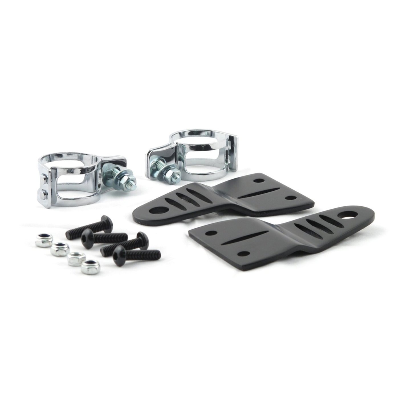 For 35-38mm fork tube diameter. Chrome plated steel fork tube clamps, fits fork tubes with diameters as indicated. Black finished aluminum slotted brackets.