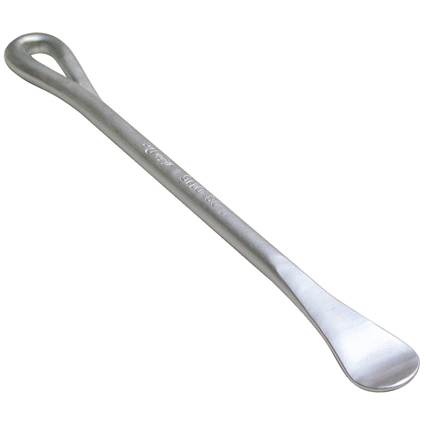 Cold forged steel; Hard nickel pewter finish; Curved end; Weight 119 gram; Dimensions: 10″ (25.4cm) long x 1″ (2.5cm) wide spoon end