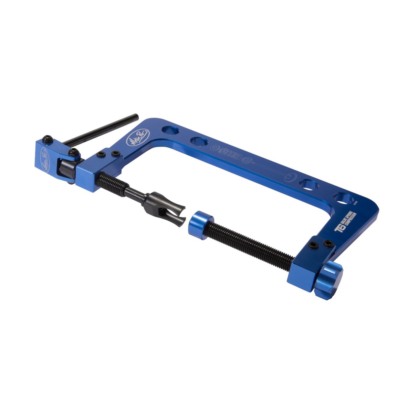 Incl. 24mm & 28mm outside diameter aluminum adapters. Billet 6061-T6 aluminum frame provides unmatched strength and stiffness and lower weight. Quick release system presses straight against the retainer to eliminate side loading the valve and keepers. Works on all motorcycle, ATV, UTV, and small engine cylinder heads. Fully adjustable top and bottom. Aluminum lower adjuster will not damage or scratch valves. Includes two universal fork style tips/adapters. Durable blue anodized finish with laser engraved markings. Simple, fast, and easy to use. Note: See 580891 for 18mm & 28mm outside diameter adapters.