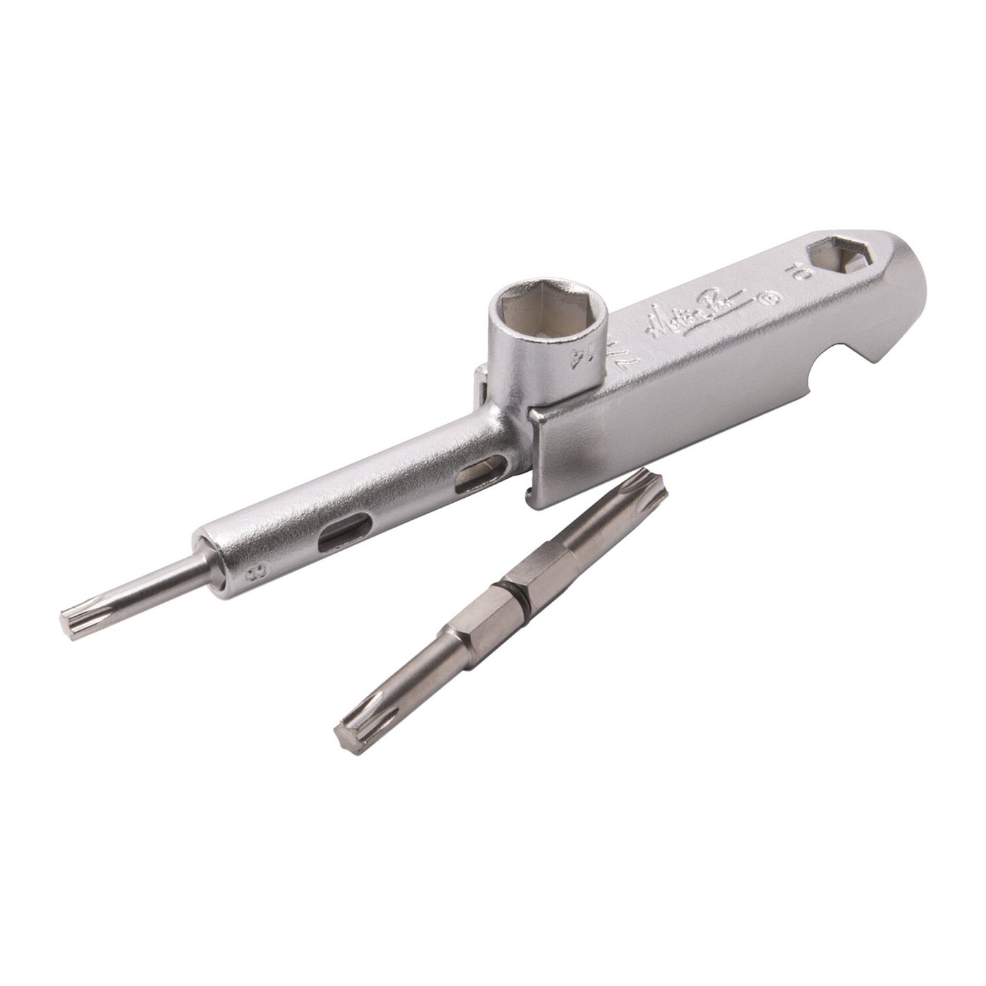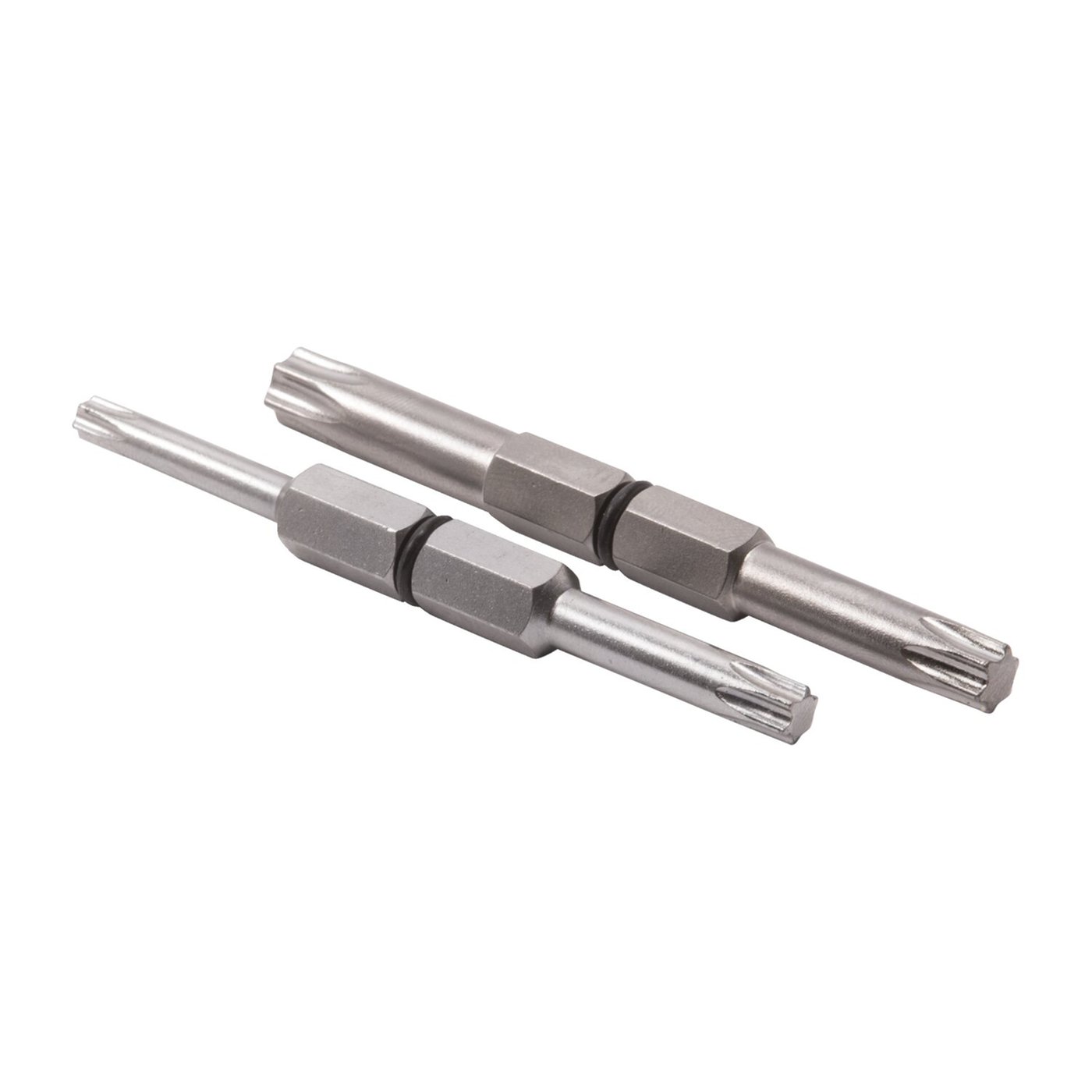 Double ended Torx bits. Includes T25/T30 and T40/T45. Fits 547069 multi-purpose tool and universal applicable. Pewter finish. Rubber O-ring to keep bits in place.