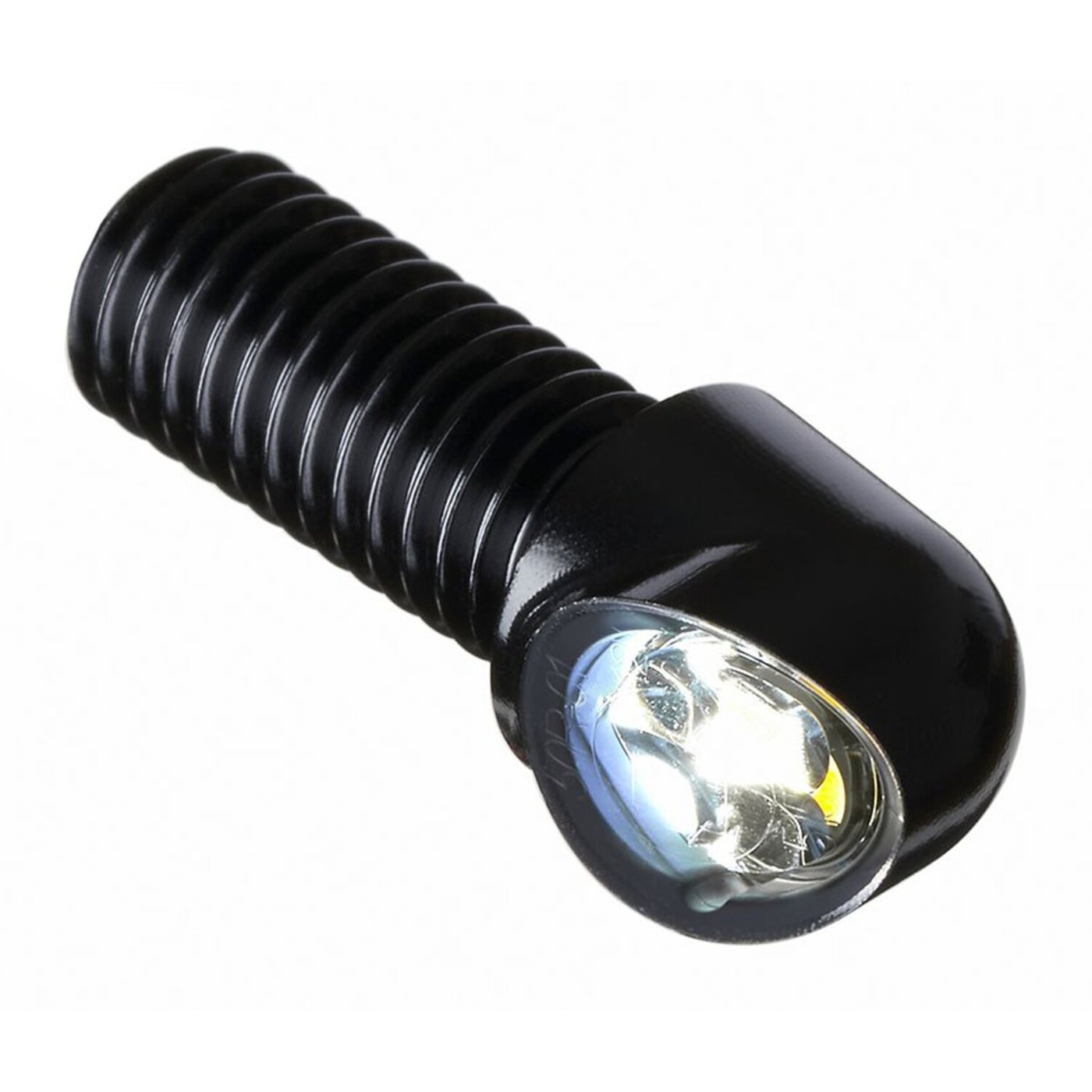 Black anodized finish. Turn signal with position light. ECE approved for front turn signal use. M8 threaded with a miniature aluminum housing. At the time of introduction these mo.blaze tens are the smallest lights, for this application, in the world. The development of a special lens, offering a lateral beam, made increased visibility from an angle possible. The LEDs used are offer the highest light output available through the use of the latest LED technology. Power consumption is 1 Watt each. Dimensions: Housing 11mm long x 11mm diameter. Overall length with M8 threaded stud 29mm. Wiring length approx. 110cm. Weight with wire approx. 20 grams. Complete with installation instructions. Note: Sold each. Order two to receive one pair.