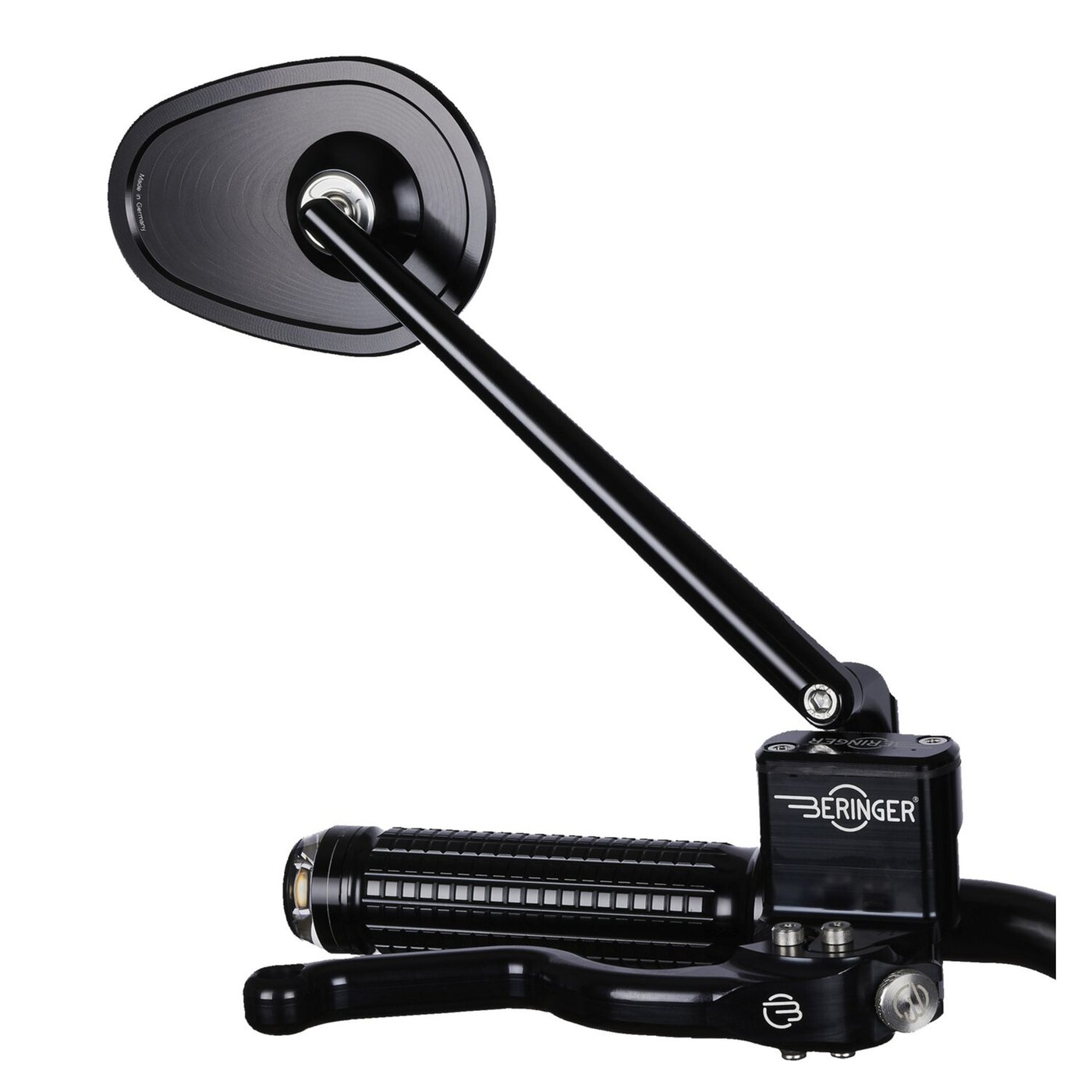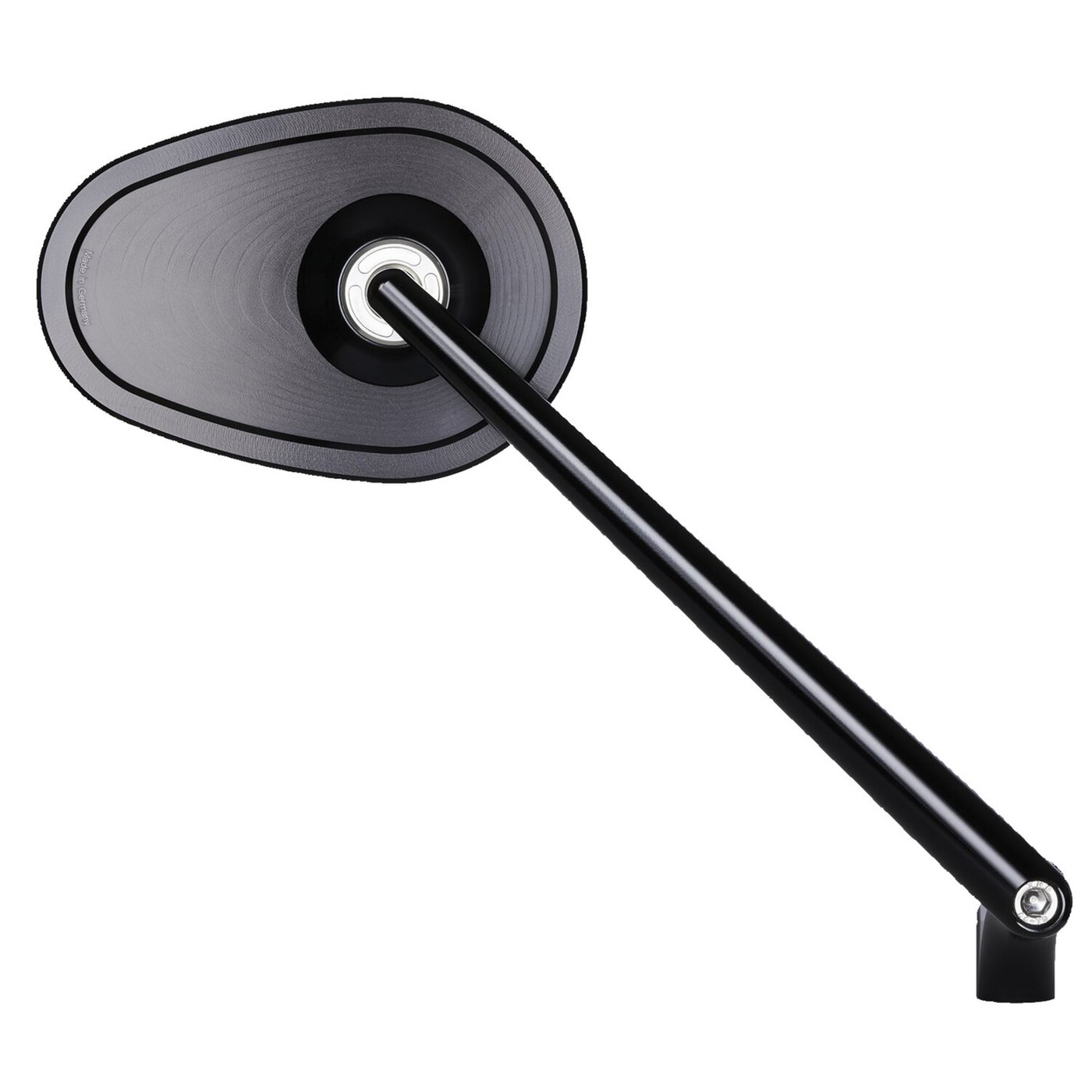 ECE approved; handlebar end mirror; aluminum; Oval, 114mm wide x 80mm high; Stem length 180mm. Motogadget mo.view mirrors are glassless. CNC machined from aluminum and finish-anodized, but a regular glass lens is not used. Instead the patented mirror surface is convex cut directly from the aluminum. This is done with ultra-precision diamond tools using a special ´flycutting´ procedure after which it is made corrosion and scratch resistant by a special vacuum plasma coating process. Available in regular and handlebar-end mirrors. Left & right side compatible, except where noted, allows above or below bar end installation and mounts directly onto or into 22mm or 1″ diameter handlebars. Body thickness approx. 4.2mm without ball head. Note: Installation compatible with Motogadget bar end turn signals, the mo.grip and the push button controls mo.switch and mo.switch mini. Note: Installs to all M10 holes. Incl. M10 x 1.50, M10 x 1.25 left & M10 x 1.25 right bolts.