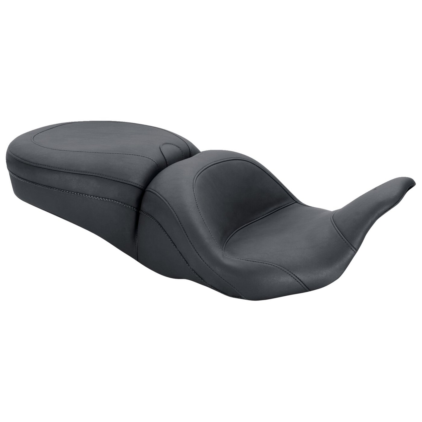 Black. Front 16-1/2″ wide, rear 14″ wide. Standard stitch. 1-1/2″ lower than stock compared to standard height models. How low can you go? When compared to stock seats the seat height is 1-1/2″ lower and the nose 1-1/2″ narrower, to decrease leg to ground distance for a confident stance. Seats are one-piece. The rider’s backrest is fully adjustable and can easily be removed. The rider has a 16-1/2″ wide bucket and the passenger section is 14″ wide. Seats will fit with a handrail. Note: Seat comes with a built-in backrest receiver for the rider. Receiver is not compatible with OEM backrests. Use 537512 for fitting rider backrest kit.
