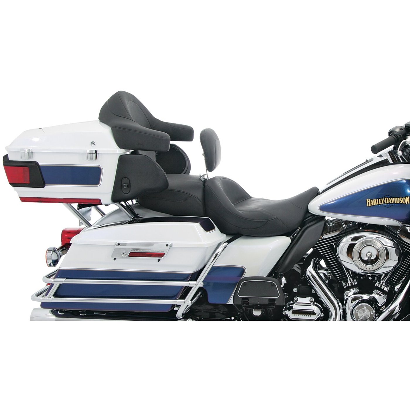 Black. Front width 19″, rear width 14″. Standard stitch. One-piece 2-up seat with an extremely comfortable and wide rider’s bucket, with an 1.75″ further backwards seating position (compared to the stock Electra Glide position), and a likewise generous passenger seating area. This one is the ultimate Mustang for some serious PowerTouring, great choice when entering the Iron Butt. Seat will fit with a handrail. Note 1: Not compatibe with H-D or regular Mustang backrest kits. They can, however, be equipped with the separetely available Mustang backrest 537512 (Smooth) or 537513 (Regal) backrest pad & post, which will fit the built-in receiver.