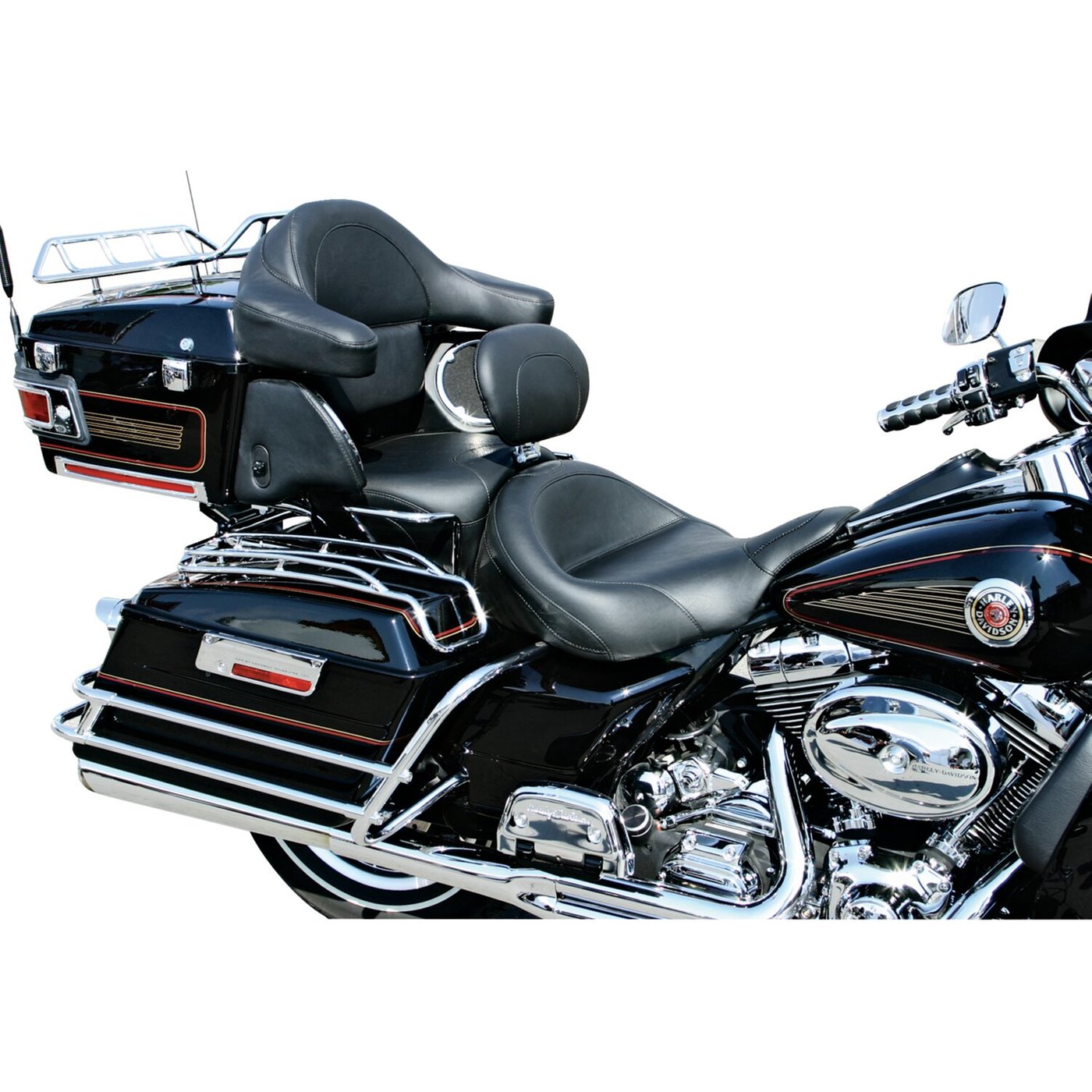Black. Front width 18″, rear width 15″. Standard stitch. One-piece seat with an ultra comfortable and extra large seating area for rider and passenger. This one will go the distance. Styling features include an extended nose with custom panel appearance, and front bucket with a full skirt and braided edge. The passenger seat has wide internal support wings to help keep passengers up off the handrail. The seat is contoured to better clear the saddlebag lids. Note: The one-piece baseplate is open in the middle and will accept a OEM or Mustang rider backrest kit, which is separately available.