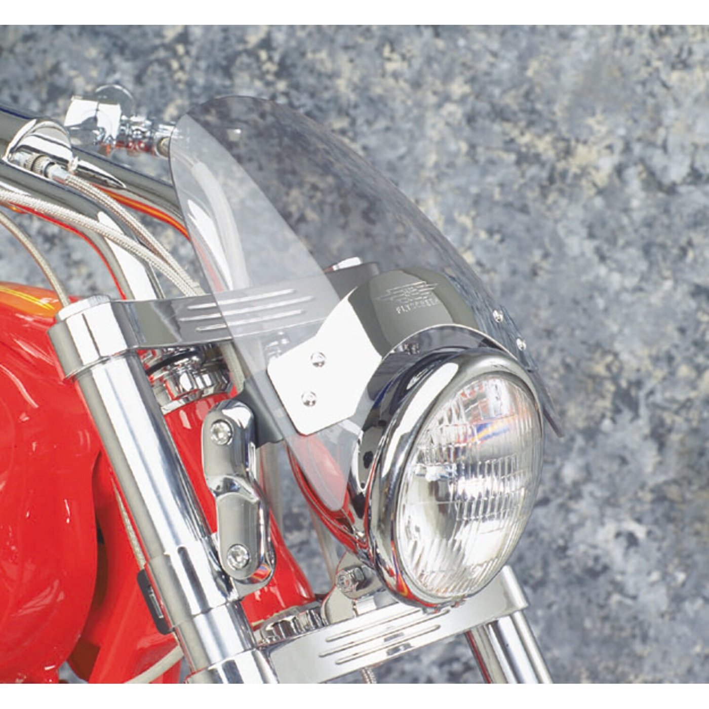 Fork mounted screen with approval. Made of 3mm thick high impact acrylic. Takes the direct wind force away from your chest. Comes with a fully adjustable mounting system with flush-fit countersunk bolts. 8.5″ (21.6cm) high from the top of the cut-outs and 9.25″ (23.5cm) wide. Fits H-D models without triple tree covers. Includes hardware. Note: Check your local MCS dealer or the MCS sales department for exact type of approval and validity on bike model and years on the test report.