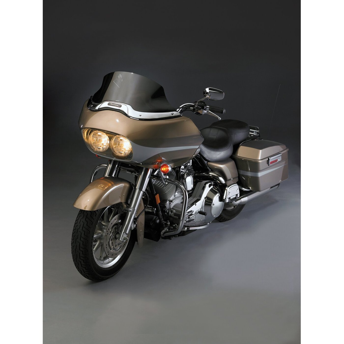 Low; dark tint; Polycarbonate shield with Quantum® surface hard coating. The advanced ‘V’ shape and dimensional contours of the VStream® windshield pushes turbulent wakes, typically referred to as the Von Karman Vortex, out and away from the side of the rider’s helmet so the rider can sit in a calm and quiet air pocket. This increases comfort not just for the rider but will even be beneficial to the passenger. The VStream® is manufactured from Polycarbonate which makes it maximum impact resistant, and the additional Quantum® surface hard coating makes this windshield superior scratch, abrasion and aging resistant. Re-use OEM hardware.