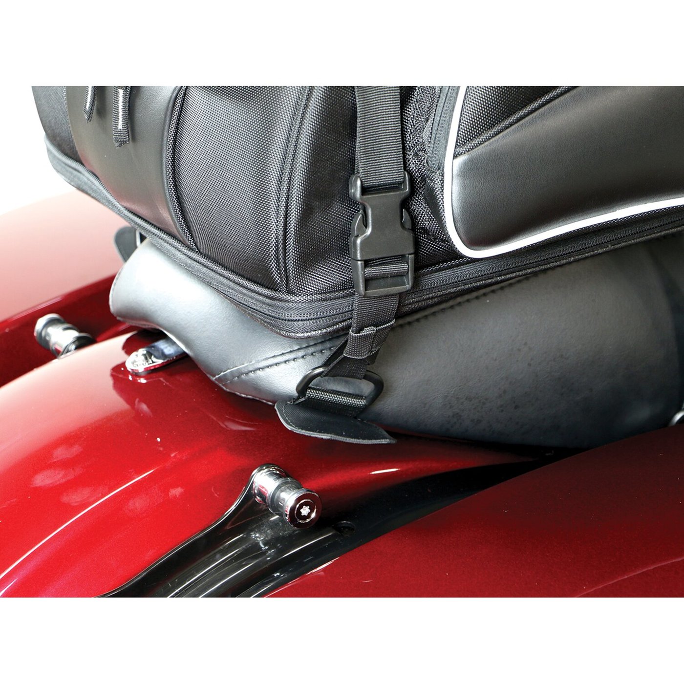 Used when you do not have a backrest or luggage rack. Mounts under the passenger seat. You can then use the metal D-rings for securely strapping your slip-free luggage to the passenger seat. – 4 heavy duty self-fastening straps – 4 metal D-rings for attaching straps and hooks – Fully adjustable to fit most under seat configurations – Protective material to help prevent scratching or movement. Note: Do not use with Route 1 Rover Pet Carrier.