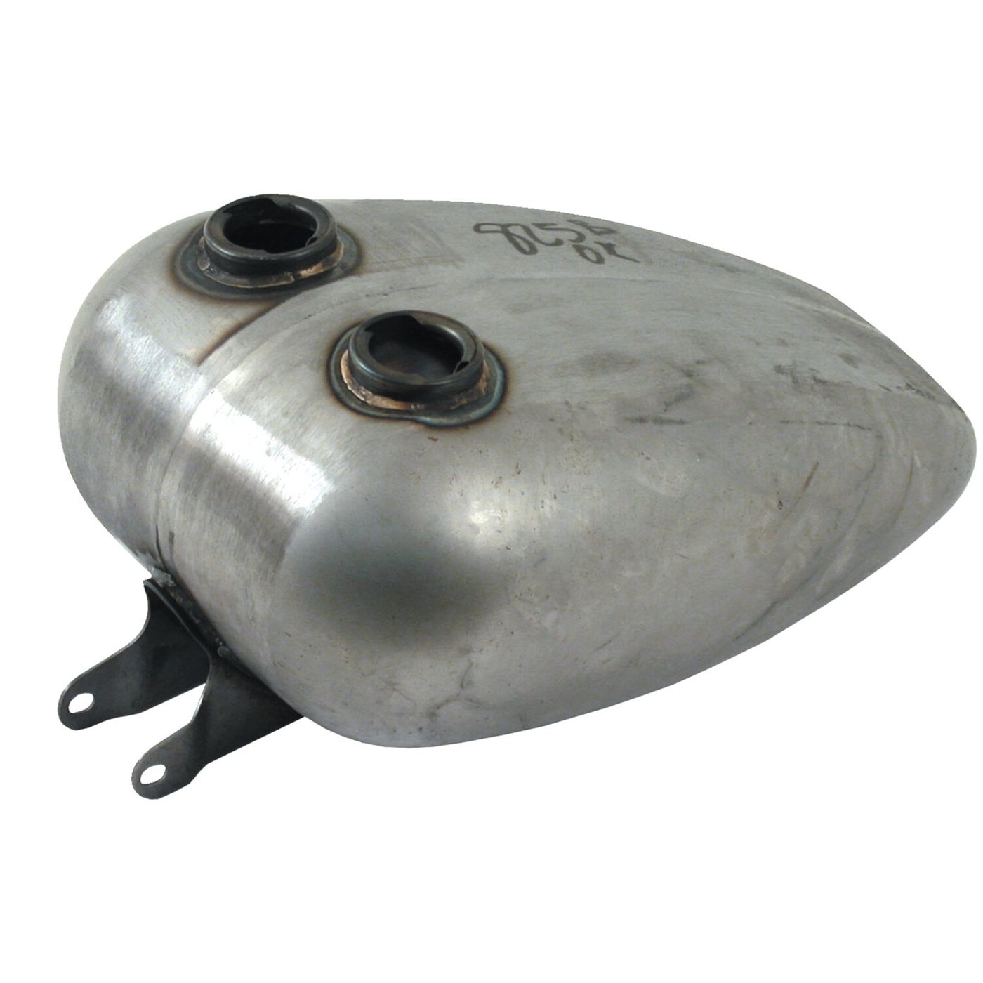 3.0 gallon (11.3 liter). Dual cap. Takes a pre-83 bajonet style vented & un-vented gas cap set and 22mm 75-up style petcock. Approx. dimensions: Tank length 16½”, tank width 12″, tank depth 7″, tunnel length 16½”, tunnel depth 2¼”, tunnel width 2¼”, hole to hole on mount bracket 14-5/8″. Note: It is advised to pressure test, seal and test fit all tanks before tanks are painted and installed. Some tanks are painted, but this coat is applied for rust prevention during storage only.