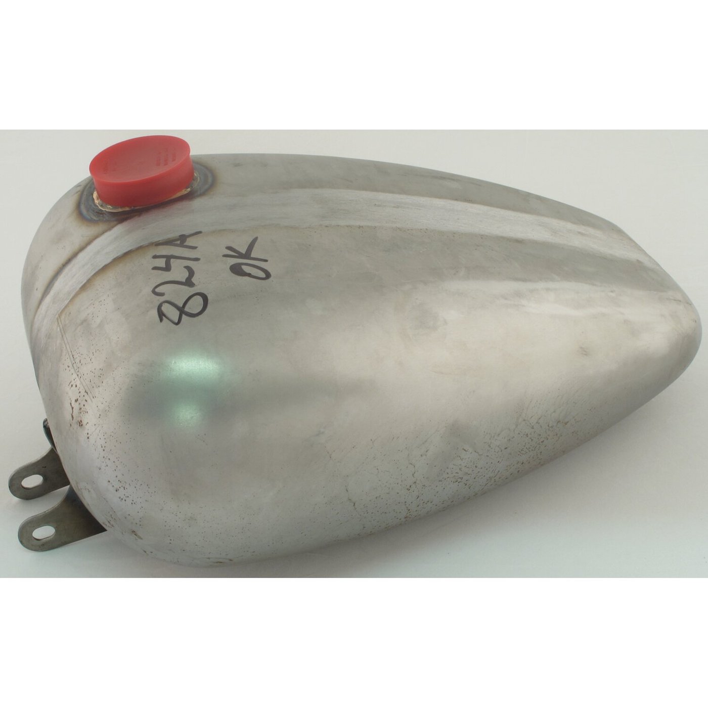 3.0 gallon (11.3 liter). Single cap. Takes pre-83 bajonet style vented gas cap and 3/8 NPT pre-75 style petcock. Approx. dimensions: Tank length 16½”, tank width 12″, tank depth 7″, tunnel length 16½”, tunnel depth 2¼”, tunnel width 2¼”, hole to hole on mount bracket 15″. Note: It is advised to pressure test, seal and test fit all tanks before tanks are painted and installed. Some tanks are painted, but this coat is applied for rust prevention during storage only.