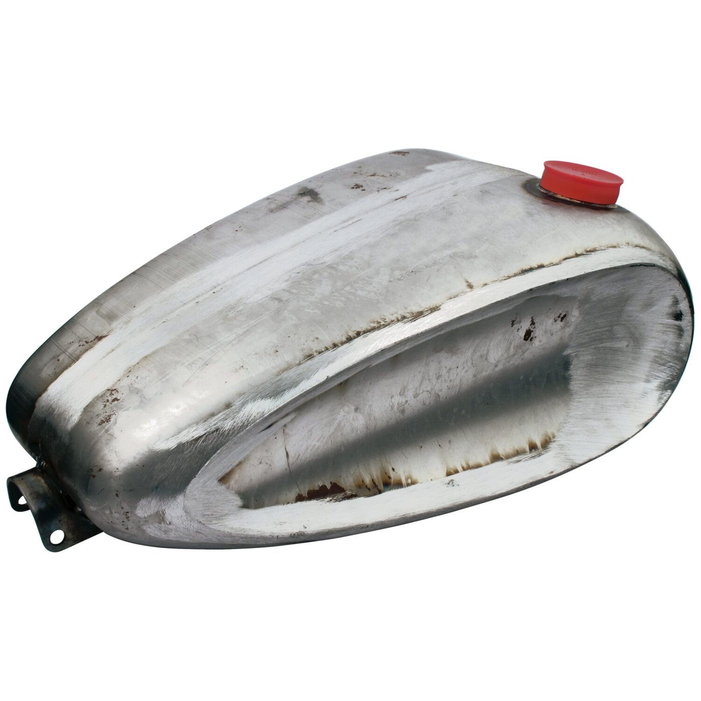 5.0 gallon. Comes with pre-83 bajonet style gas cap fitting and external threaded for 22mm petcocks. With custom ‘dished’ sides, Indian Larry style. Approx. dimensions: 19″ tank length x 13.5″ tank width x 9″ tank depth x 19″ tunnel length x 4.25″ tunnel depth x 2.5″ tunnel width x 19-5/8″ mount hole to mount hole distance. Note: It is advised to pressure test, seal and test fit all tanks before tanks are painted and installed. Some tanks are painted, but this coat is applied for rust prevention during storage only.