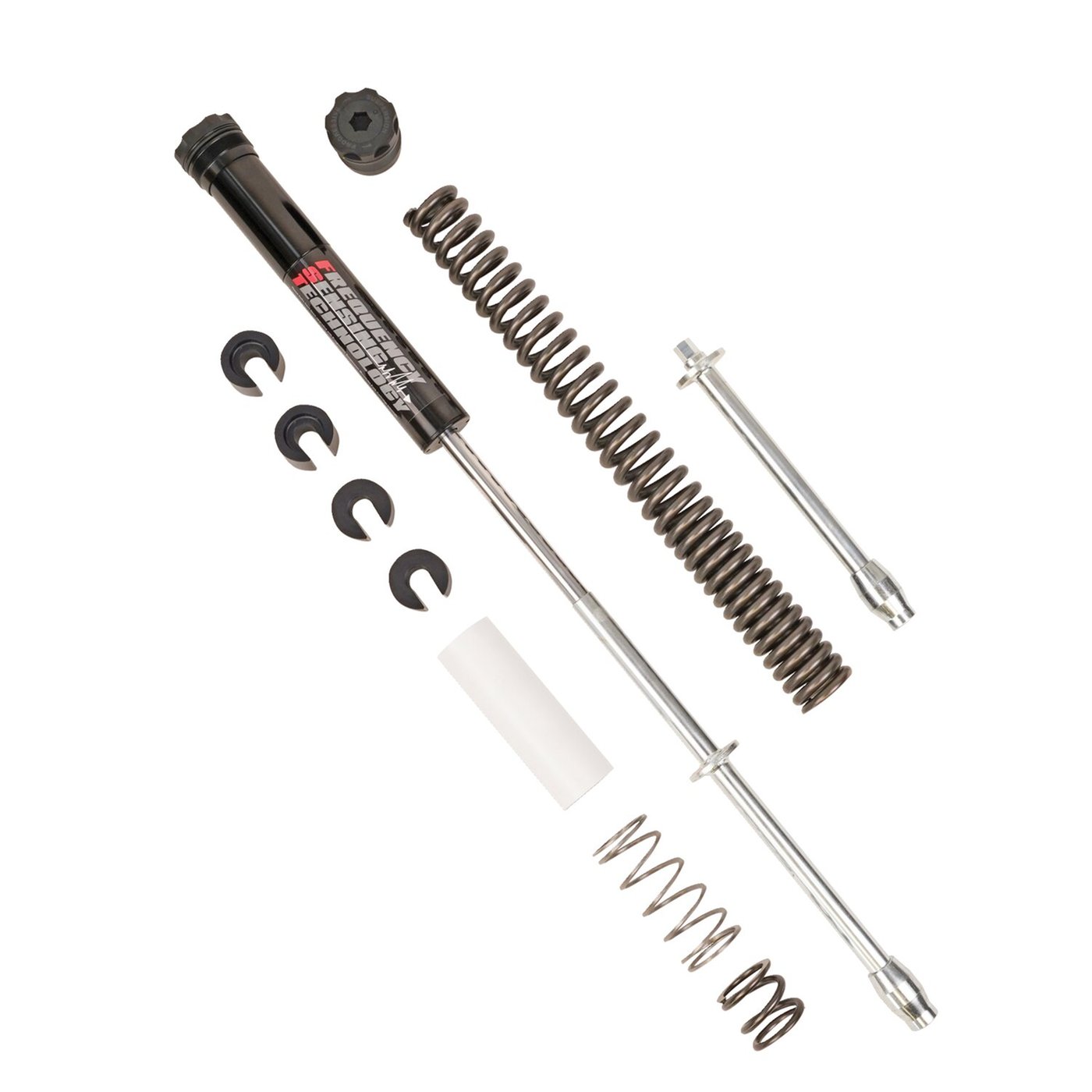 1″-2″ lowered. Asymmetrical monotube damper kit with FST damper. Threaded pre-load adjuster with 11 turns of adjustment. Progressive rate spring. No modification to forks required. The asymmetrical design places a preload adjuster over a progressive rate spring in one leg and an aluminum monotube, high pressure, nitrogen charged, sealed cartridge damper on the other. The tunable pre-load with Frequency Sensing Technology (FST) dampers and custom tuned progressive rate fork spring offers better road holding, better resistance to front brake dive, less susceptibility to bottoming out and improved stability in cornering. Comes as a complete replacement kit including all internal fork components, apart from the fork tubes and oil.