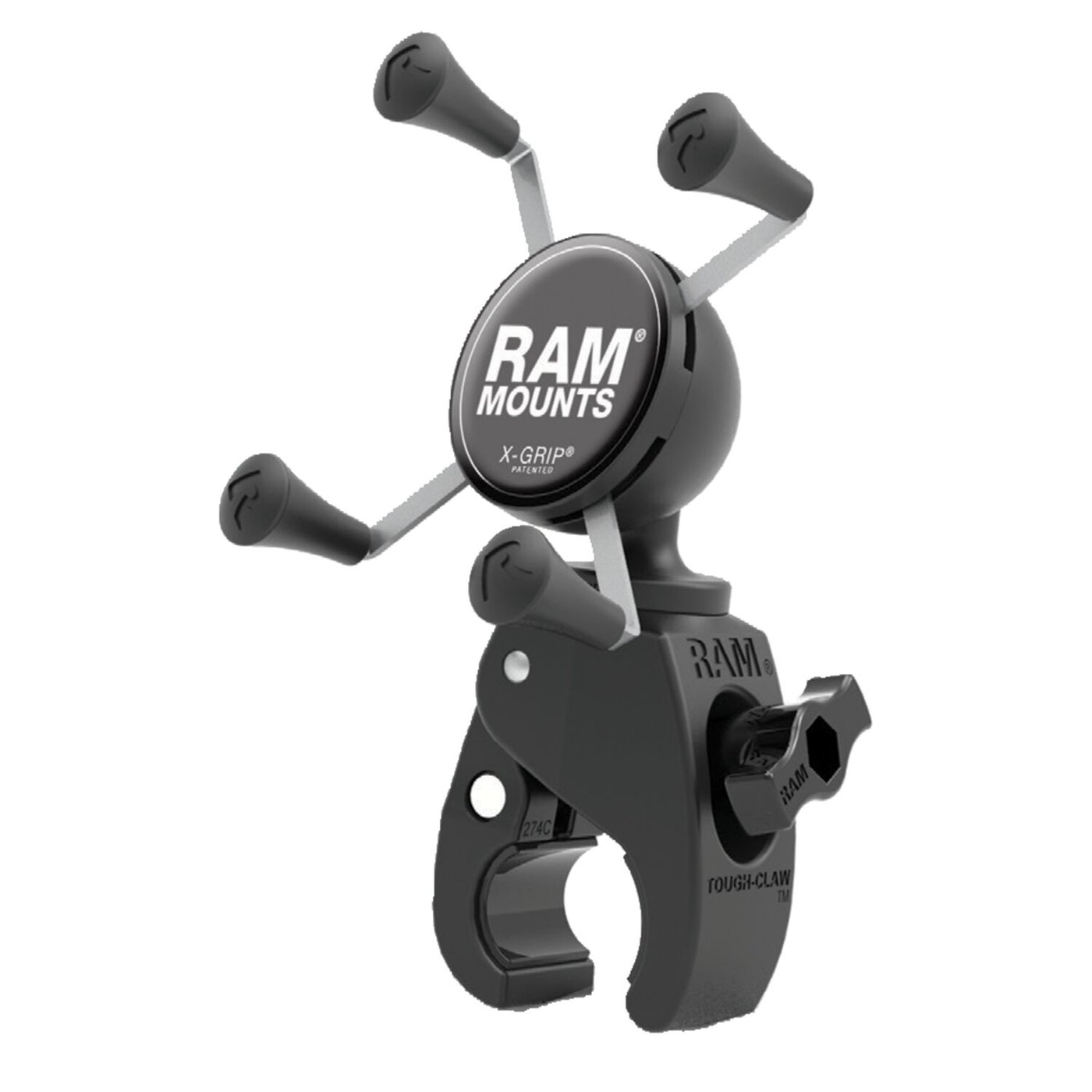 Small phone X-Grip holder. For phone / device dimensions: – Wide: 1.875″ (47.6mm) to 3.25″ (82.6mm) – Deep: max .875″ (22.2mm) X-Grip holder is directly attached to the Tough-Claw base. No socket arm used, giving it a super low profile. The ‘Tough-Claw™’ base: – Clamps to .625″ (15.9mm) to 1.5″ (38mm) diameter tubing / handlebars – Up to 1.14″ (29mm) thick flat surfaces. – Holds max. 2 lbs / 907 gram normal use or 1 lbs (454 gram) heavy duty use. – Includes: (1) Optional Tether, (1) Glue Tube for Rubber Caps. Consists of the Tough-Claw base and universal X-Grip cradle. The X-Grip cradle has a clean and clever four leg design that sports great holding power without hiding your smart-phone behind foam pads and plastic. The X-Grip cradle expands and contracts for perfect fit of most smart phones. This mount rotates 360 degrees. The X-Grip includes a device tether recommended for outdoor applications. The cradle is compatible with handheld devices that will fit the dimensions as listed. It is important to verify the dimensions of your handheld device with a case/sleeve/skin when determining the overall size. RAM Mounts – The way It Works? A 3-piece system: 1 the mount base, 2 the connecting arm, 3 the device holder. – 1 the mount base – Equipped with RAM’s 1″ diameter elastomeric hard rubber socket ball. A connection that is easy adjust, slip-free and vibration absorbing. Various mount base options available. – 2 socket arm / connecting arm – A connecting arm with sockets that grip the rubber balls of the mount base and of the phone holder, effectively connecting both parts while offering virtual infinite tool-free adjustments. – 3 Phone holder / X-Grip – An innovative spring-loaded system with rubber caps on the ‘fingers’ that will clamp your phone. The X-Grip phone holder is equipped with RAM’s elastomeric hard rubber socket ball for a slip-free, vibration absorbing mount to the socket arm.