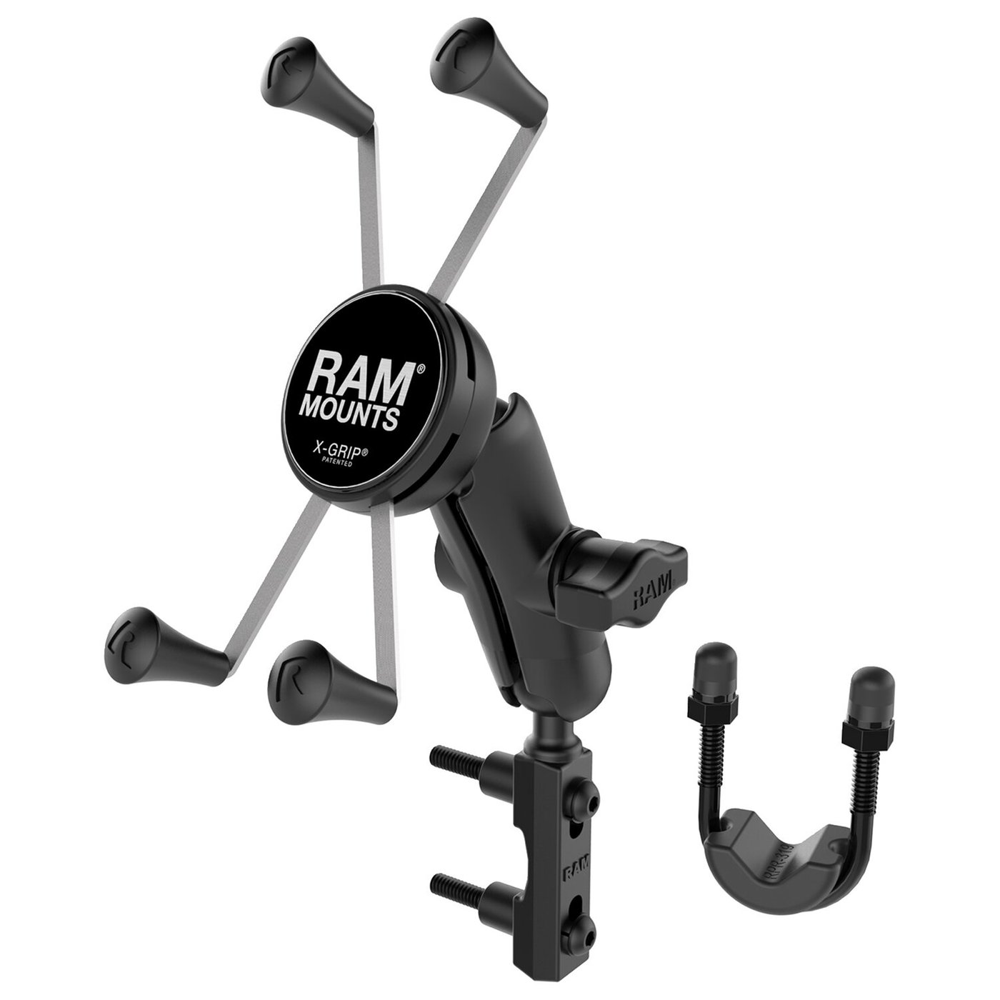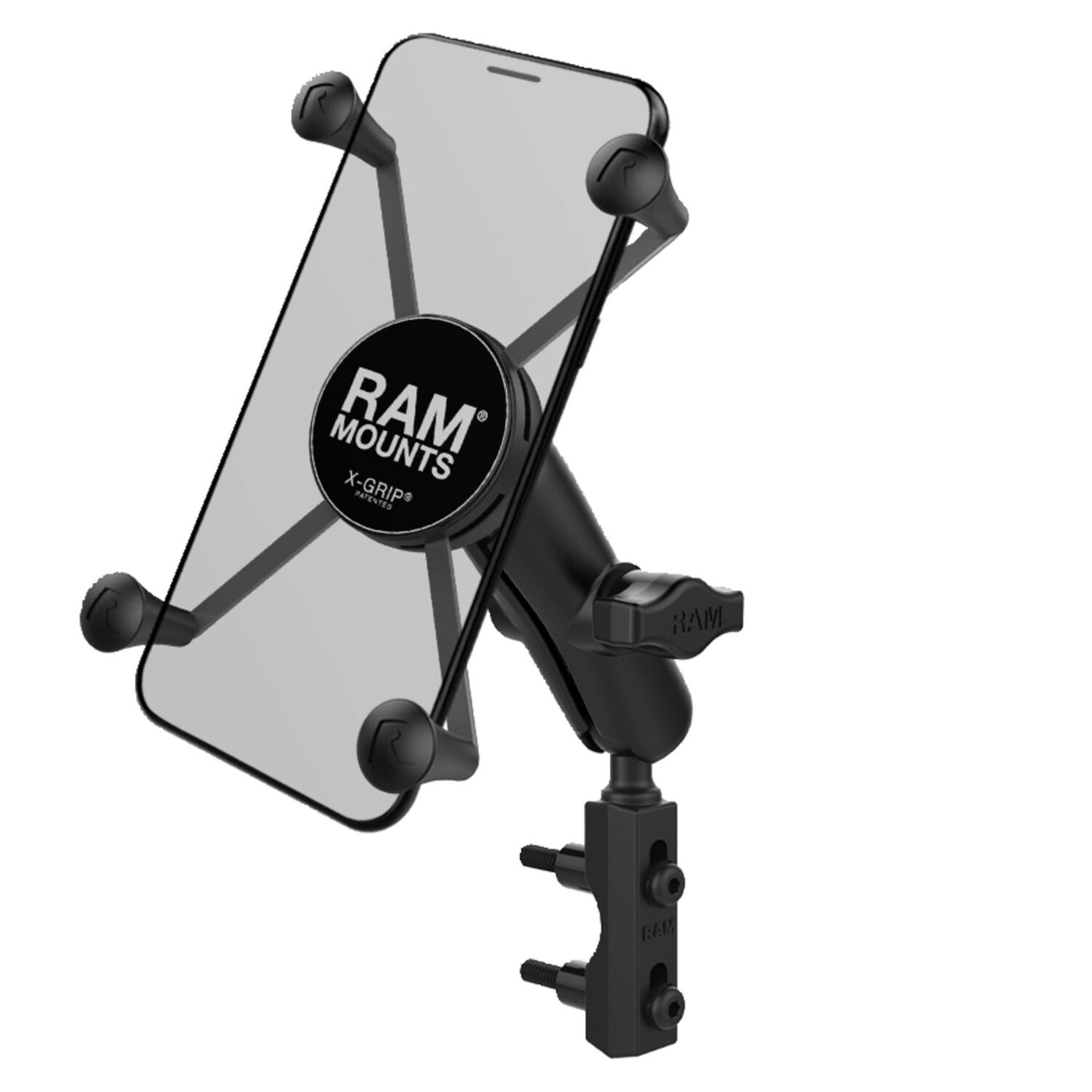 X-Grip holder for large phone size: – Wide: 1.75″ (44.5mm) to 4.5″ (114.3mm) – Deep: max .875″ (22.2mm) – Medium 3″ (76mm) ball to ball socket arm – A brake / clutch reservoir – Two ‘U-bolt’ bases that will give various mounting options to round and square tubing – Clamps to 1/2″ (12.7mm) to 1.25″ (31.8mm) diameter tubes handlebars / tubing / rails – Holds max. 2 lbs / 907 gram normal use or 1 lbs (454 gram) heavy duty use – Includes: (1) Optional Tether, (1) Glue Tube for Rubber Caps, (2) M6 x 55mm Hex Bolts, (2) #1/4-20 x 2″ Hex Bolts, (2) 1/4″-20 x 2.5″ Hex Bolts, (2) 1/2″ Spacers, (2) 1/4″ Split Lock Washers, (1) 1/4″-20 U-Bolt for .5″ – 1″ Rails, (1) 1/4″-20 U-Bolt for 1″ – 1.25″ Rails – Materials used: Marine-grade aluminum, high strength composite, stainless steel. Consists of hardware for mounting to either brake/clutch reservoirs and rails that are 0.5″ to 1.25″ in diameter, short length double socket arm and universal X-Grip cell phone cradle. Designed into the mount is a 1″ diameter patented rubber ball and socket system with adjustment points at both ends of the socket arm; this with a twist of the arm knob, allows you to move the X-Grip mount to your optimum viewing position. The mounting hardware for brake/clutch reservoirs include both standard and metric mounting bolts. The included X-Grip cradle has a clean and clever four leg design that sports great holding power without hiding your phone behind foam pads and plastic. The spring loaded X-Grip cradle expands and contracts, allowing for a perfect custom fit of your cell phone. The perfect complement to the modern sleek interior of today’s vehicles, the RAM X-Grip is the cell phone cradle evolved. The included X-Grip cradle has a clean and clever four leg design that sports great holding power without hiding your phone behind foam pads and plastic. The spring loaded X-Grip cradle expands and contracts, allowing for a perfect custom fit of your cell phone. The perfect complement to the modern sleek interior of today’s vehicles, the RAM X-Grip is the cell phone cradle evolved. The X-Grip includes a device tether recommended for outdoor applications. The cradle is compatible with handheld devices that will fit the dimensions listed below. It is important to verify the dimensions of your handheld device with a case/sleeve/skin when determining the overall size. RAM Mounts – The way It Works? A 3-piece system: 1 the mount base, 2 the connecting arm, 3 the device holder. – 1 the mount base – Equipped with RAM’s 1″ diameter elastomeric hard rubber socket ball. A connection that is easy adjust, slip-free and vibration absorbing. Various mount base options available. – 2 socket arm / connecting arm – A connecting arm with sockets that grip the rubber balls of the mount base and of the phone holder, effectively connecting both parts while offering virtual infinite tool-free adjustments. – 3 Phone holder / X-Grip – An innovative spring-loaded system with rubber caps on the ‘fingers’ that will clamp your phone. The X-Grip phone holder is equipped with RAM’s elastomeric hard rubber socket ball for a slip-free, vibration absorbing mount to the socket arm.