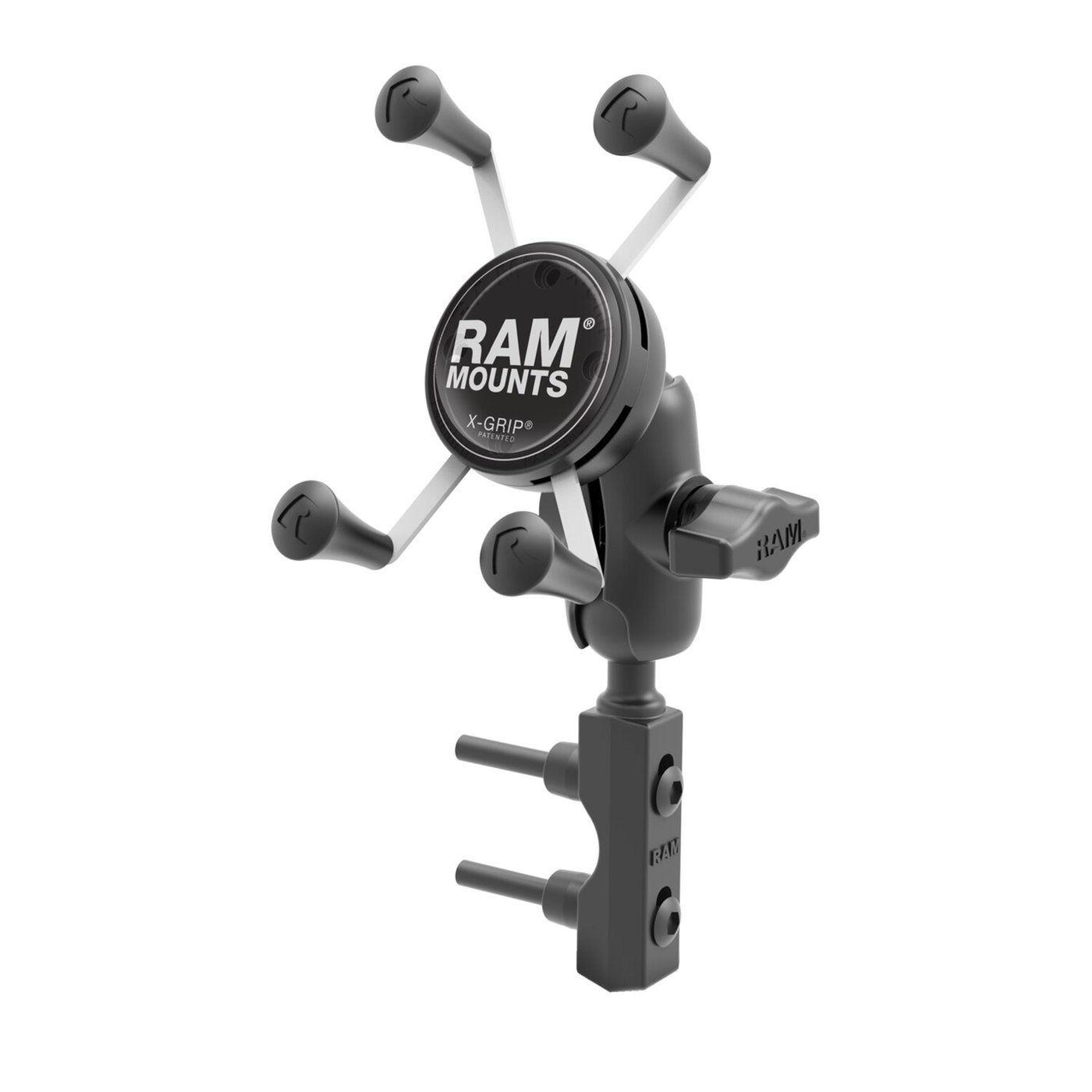 – Small Phone X-Grip holder – For phones 1.875″ (47.6mm) to 3.25″ (82.6mm) wide and max .875″ (22.2mm) deep – Short 1.75″ (44.5mm) ball to ball socket arm – A brake / clutch reservoir – Two ‘U-bolt’ bases that will give various mounting options to round and square tubing – Clamps to 1/2″ (12.7mm) to 1.25″ (31.8mm) diameter tubes handlebars / tubing / rails – Holds max. 2 lbs / 907 gram normal use or 1 lbs (454 gram) heavy duty use – Includes: (1) Optional Tether, (1) Glue Tube for Rubber Caps, (2) M6 x 55mm Hex Bolts, (2) #1/4-20 x 2″ Hex Bolts, (2) 1/4″-20 x 2.5″ Hex Bolts, (2) 1/2″ Spacers, (2) 1/4″ Split Lock Washers, (1) 1/4″-20 U-Bolt for .5″ – 1″ Rails, (1) 1/4″-20 U-Bolt for 1″ – 1.25″ Rails – Materials used: Marine-grade aluminum, high strength composite, stainless steel. Consists of hardware for mounting to either brake/clutch reservoirs and rails that are 0.5″ to 1.25″ in diameter, short length double socket arm and universal X-Grip cell phone cradle. Designed into the mount is a 1″ diameter patented rubber ball and socket system with adjustment points at both ends of the socket arm; this with a twist of the arm knob, allows you to move the X-Grip mount to your optimum viewing position. The mounting hardware for brake/clutch reservoirs include both standard and metric mounting bolts. The included X-Grip cradle has a clean and clever four leg design that sports great holding power without hiding your phone behind foam pads and plastic. The spring loaded X-Grip cradle expands and contracts, allowing for a perfect custom fit of your cell phone. The perfect complement to the modern sleek interior of today’s vehicles, the RAM X-Grip is the cell phone cradle evolved. The included X-Grip cradle has a clean and clever four leg design that sports great holding power without hiding your phone behind foam pads and plastic. The spring loaded X-Grip cradle expands and contracts, allowing for a perfect custom fit of your cell phone. The perfect complement to the modern sleek interior of today’s vehicles, the RAM X-Grip is the cell phone cradle evolved. The X-Grip includes a device tether recommended for outdoor applications. The cradle is compatible with handheld devices that will fit the dimensions listed below. It is important to verify the dimensions of your handheld device with a case/sleeve/skin when determining the overall size. RAM Mounts – The way It Works? A 3-piece system: 1 the mount base, 2 the connecting arm, 3 the device holder. – 1 the mount base – Equipped with RAM’s 1″ diameter elastomeric hard rubber socket ball. A connection that is easy adjust, slip-free and vibration absorbing. Various mount base options available. – 2 socket arm / connecting arm – A connecting arm with sockets that grip the rubber balls of the mount base and of the phone holder, effectively connecting both parts while offering virtual infinite tool-free adjustments. – 3 Phone holder / X-Grip – An innovative spring-loaded system with rubber caps on the ‘fingers’ that will clamp your phone. The X-Grip phone holder is equipped with RAM’s elastomeric hard rubber socket ball for a slip-free, vibration absorbing mount to the socket arm.