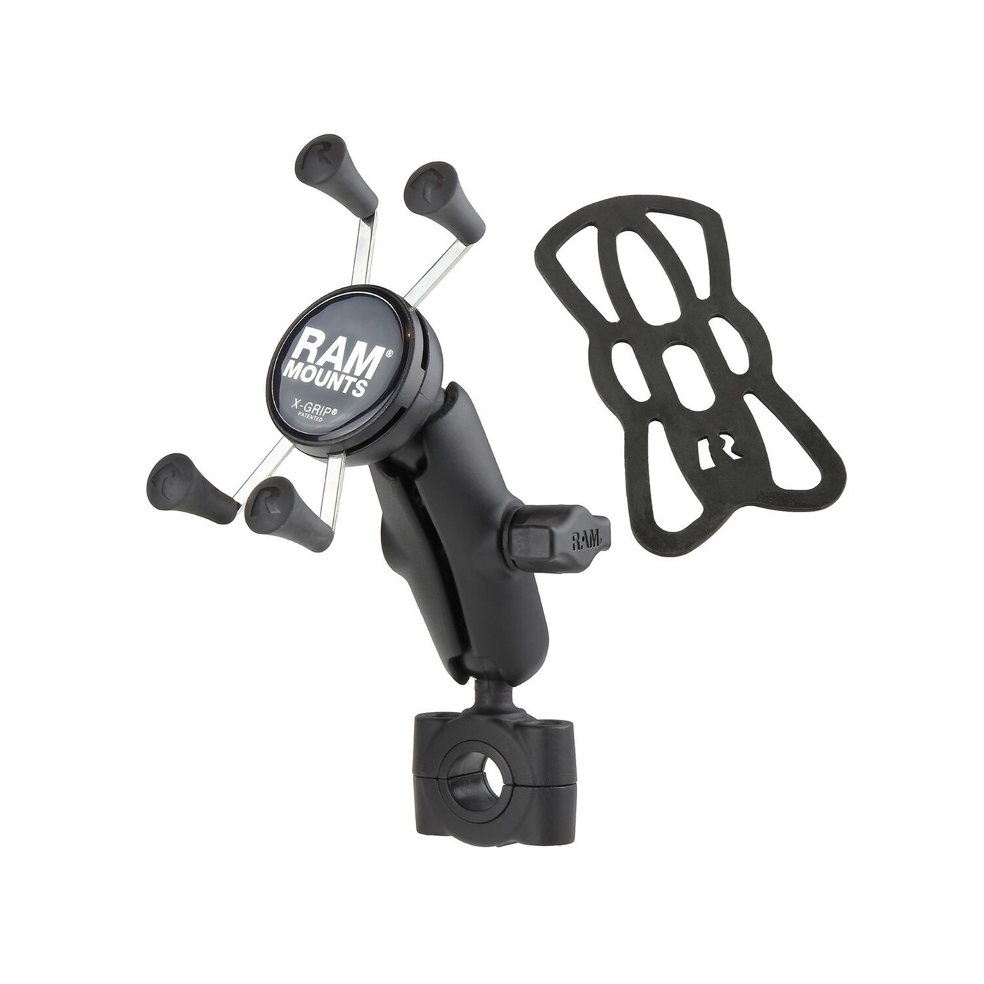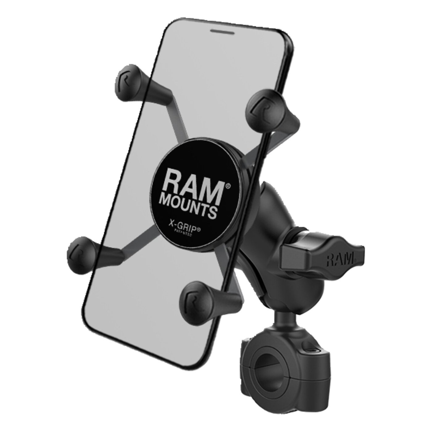 – Small Phone X-Grip holder – For phones 1.875″ (47.6mm) to 3.25″ (82.6mm) wide and max .875″ (22.2mm) deep – For 3/4″ (22mm) to 1″ (25.4mm) round bars – Short 1.75″ (44.5mm) ball to ball socket arm – Comes with the X-Grip, a socket arm and a ‘Torque’ base handlebar clamp mount – Holds max. 2 lbs / 907 gram normal use or 1 lbs (454 gram) heavy duty use. Take your mobile entertainment on the road with the RAM® Torque™ handlebar and rail mounting base. Sizing inserts are included to provide a snug fit and offer additional protection for the rail. The mount utilizes nylon-insert locknuts to prevent loosening in high vibration environments. This low-profile mount is the perfect way to secure your personal electronics and small accessories in any high-vibration environment. The included X-Grip® cradle has a clean and clever four leg design that sports great holding power without hiding your phone behind foam pads and plastic. The spring loaded X-Grip® cradle expands and contracts, allowing for a perfect custom fit of your cell phone. The perfect complement to the modern sleek interior of today’s vehicles, the RAM X-Grip® is the cell phone cradle evolved. The X-Grip® includes a device tether recommended for outdoor applications. It is important to verify the dimensions of your handheld device with a case/sleeve/skin when determining the overall size. RAM Mounts – The way It Works? A 3-piece system: 1 the mount base, 2 the connecting arm, 3 the device holder. – 1 the mount base – Equipped with RAM’s 1″ diameter elastomeric hard rubber socket ball. A connection that is easy adjust, slip-free and vibration absorbing. Various mount base options available. – 2 socket arm / connecting arm – A connecting arm with sockets that grip the rubber balls of the mount base and of the phone holder, effectively connecting both parts while offering virtual infinite tool-free adjustments. – 3 Phone holder / X-Grip – An innovative spring-loaded system with rubber caps on the ‘fingers’ that will clamp your phone. The X-Grip phone holder is equipped with RAM’s elastomeric hard rubber socket ball for a slip-free, vibration absorbing mount to the socket arm.