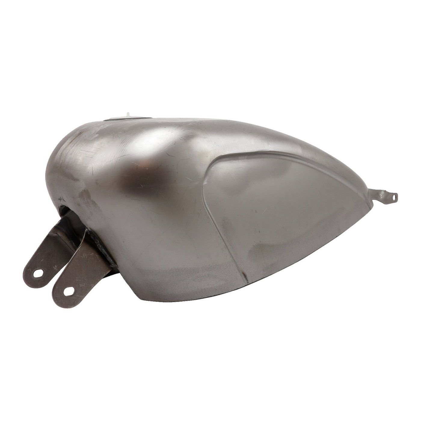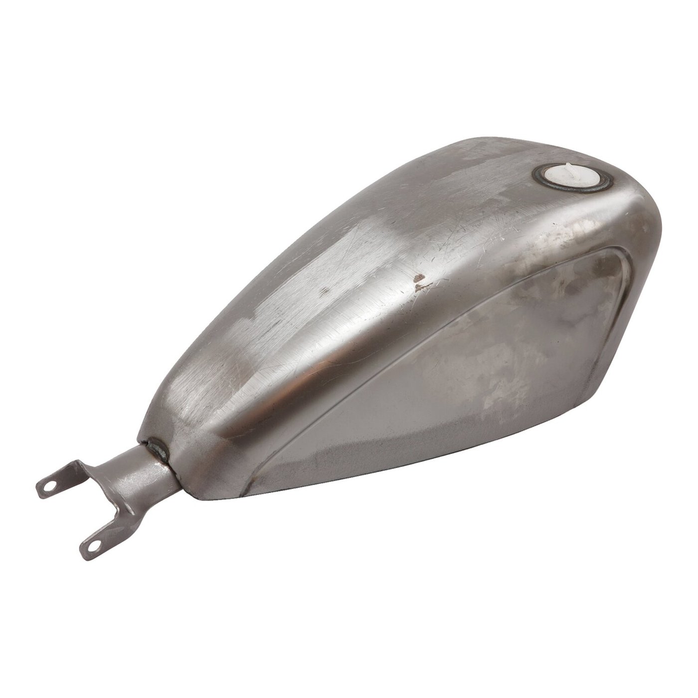 Raw steel. This is the original Sportster Iron Guerilla fuel tank that won Winston his first bike building Word Championship. A slim design that resembles a classic Sportster tank but that transformed with Winston’s artistic creativity to something way more. This tank will complement a bone stock Sportster but will also shine as the centerpiece on a wild custom, not many can do that. Compatible with all OEM & OEM style fuel pump components and screw-in gas caps. Dimensions approx.: 22.8cm overall width x 49.2cm overall length tank body (excl. the brackets). Capacity approx. 9 liter (2.4 gallon).
