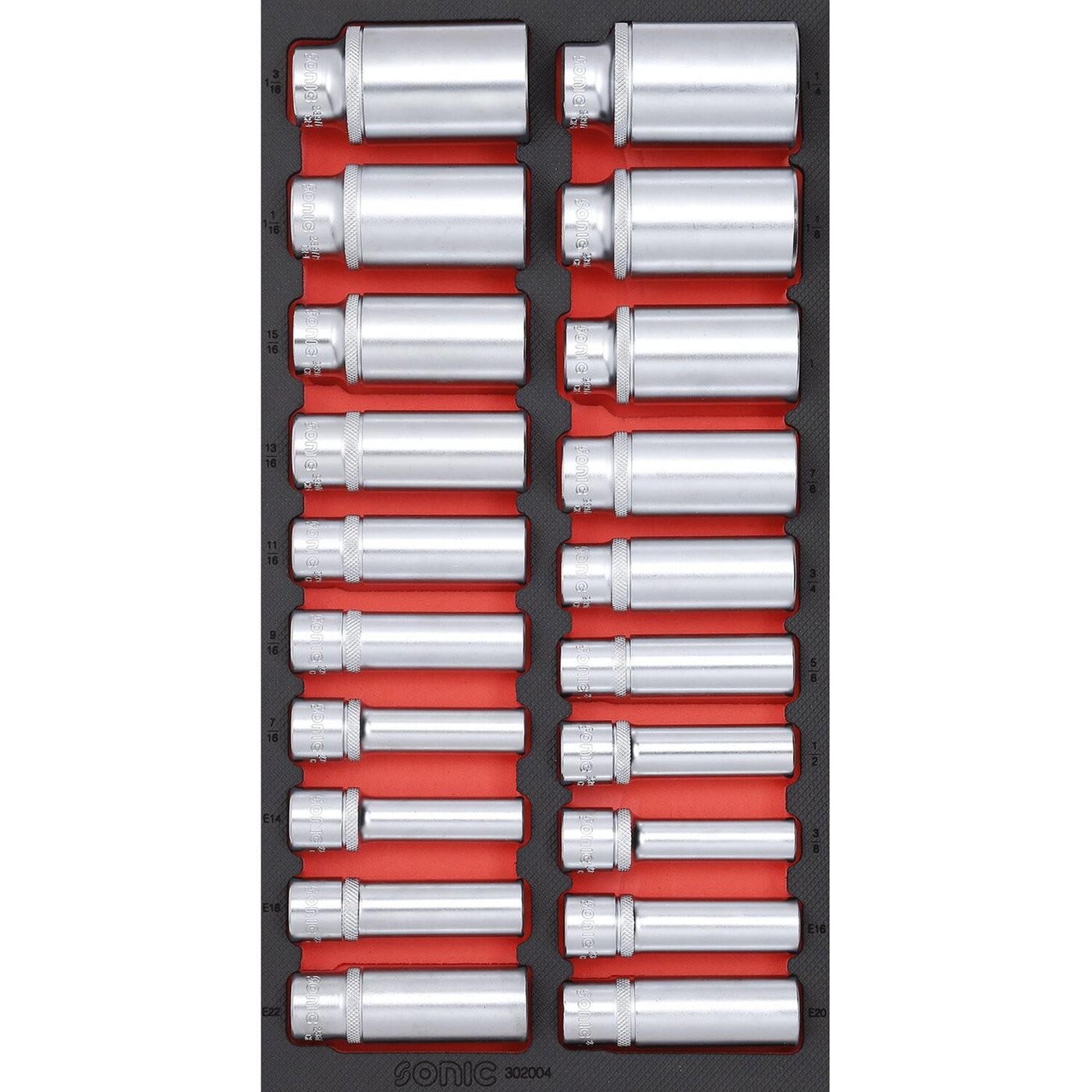Home > Workshop > General Tools > Hand Tools > Sockets > Sonic, 1/2″ drive Deep socket set. 20-piece. US/SAE sizes