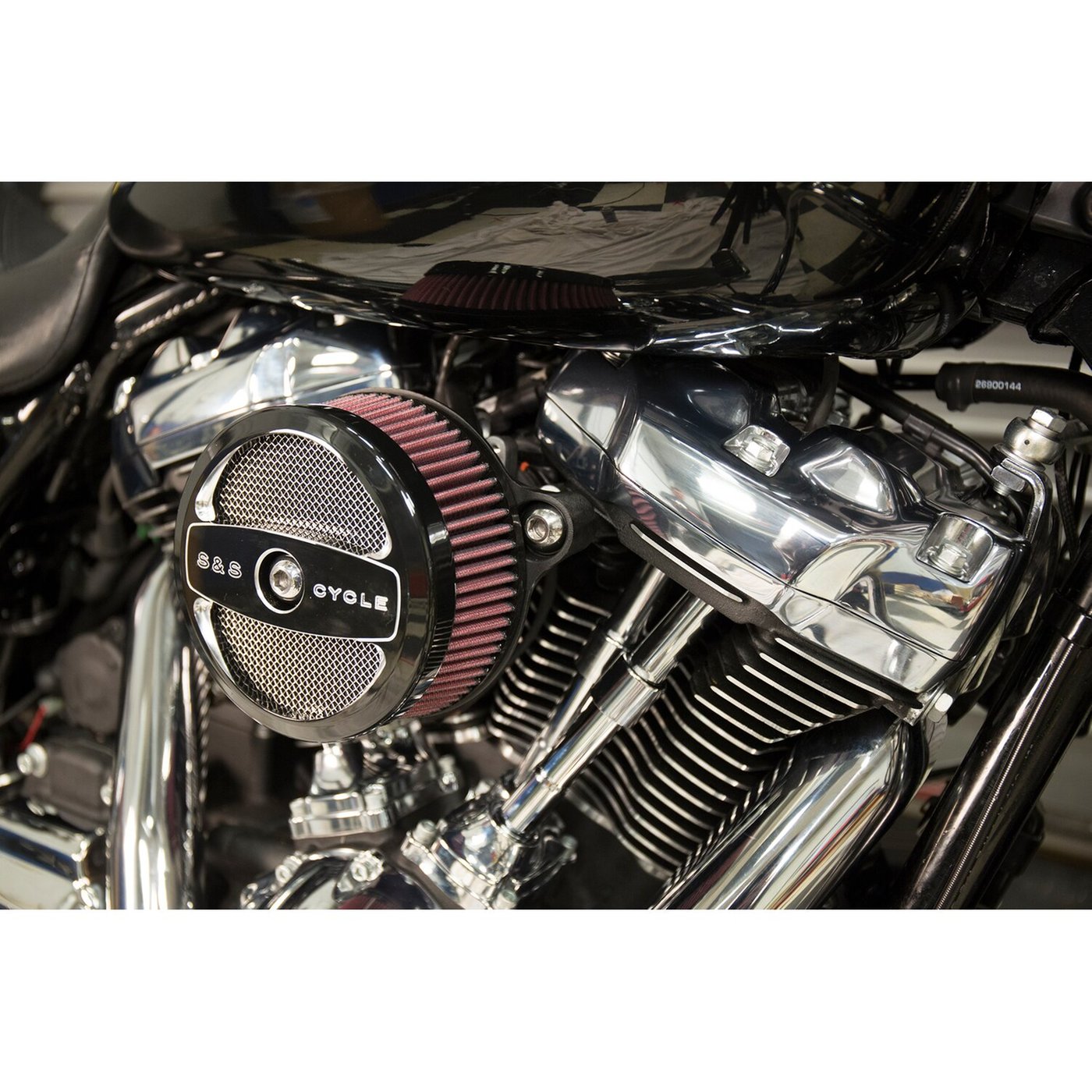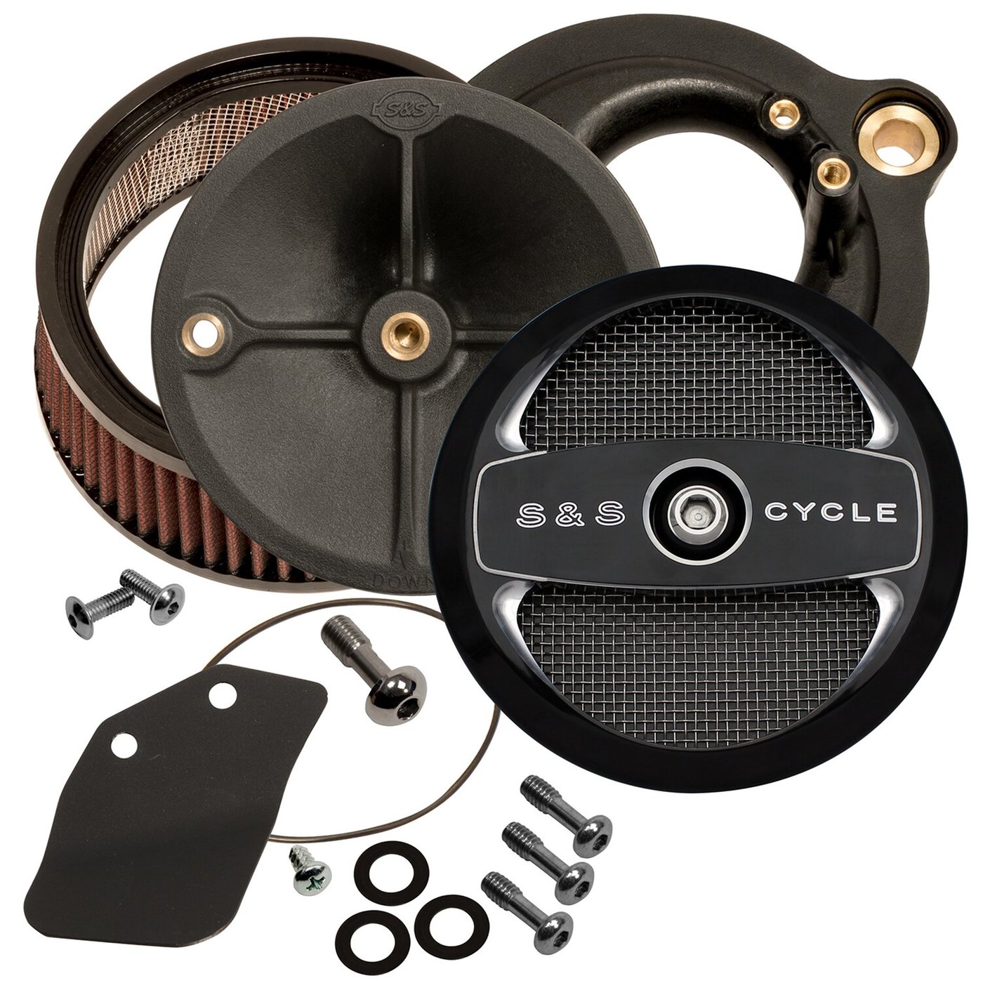 Black contrast machined. With Air 1 cover. Includes a High-Flow filter element and an air directional stinger cone to guide the flow of air as smoothly as possible into the engine. Note: This filter can be used with the stock air cleaner cover, for a true stealth mode, but 558651 adapter is required when installing the OEM air cleaner cover.