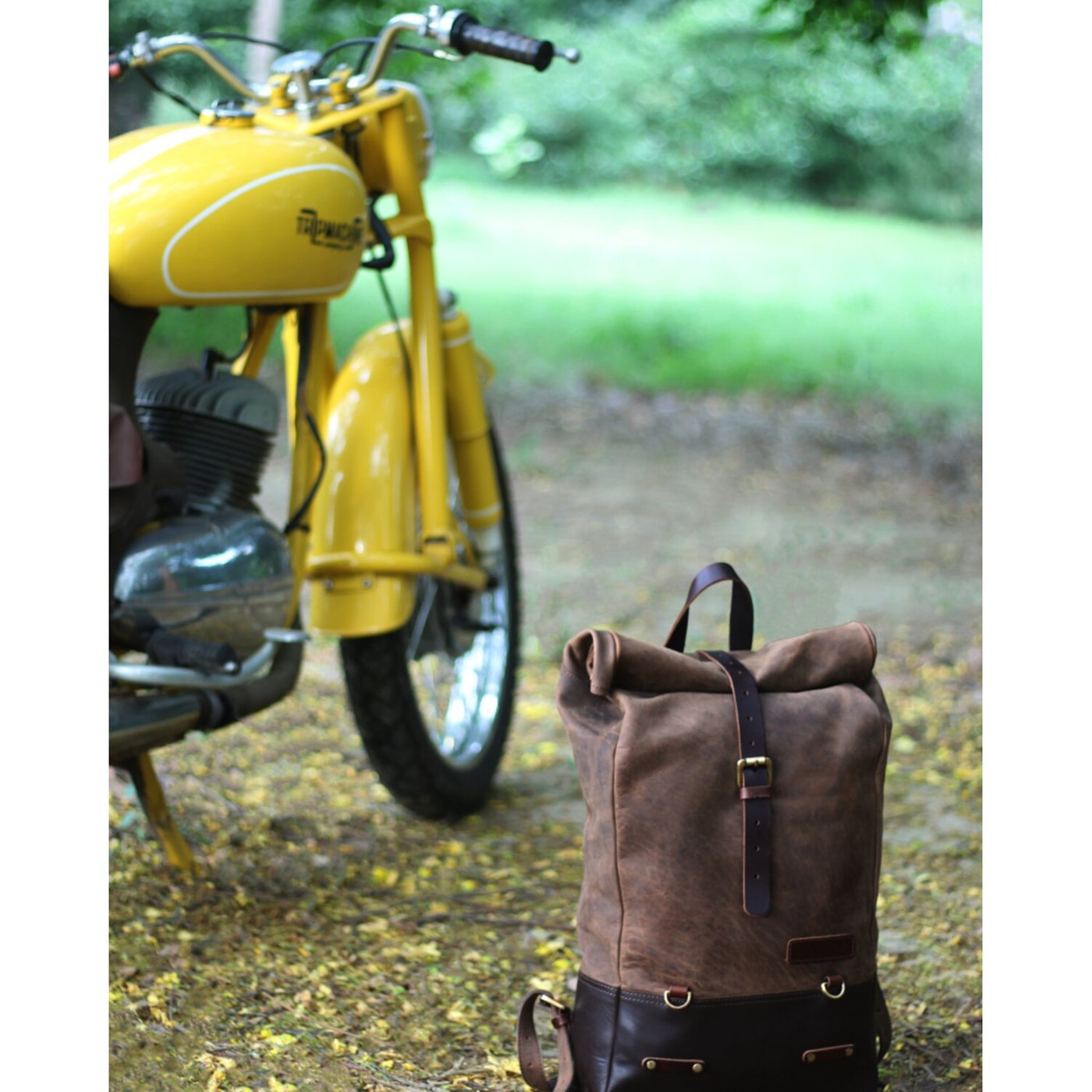This backpack is a high quality hand made build that is ready for dual use, on your back or as saddlebag. Made completely from 100% Heavy Duty leather and 0% compromise. Made for years of use and the looks get better with every trip. Designed to be easy on/off install on the motorcycle in a matter of seconds. A backpack for true everyday use. The classic roll-top design provides additional flexibility. Comes with a carrying handle for when off-bike. Approx. dimensions: 18″ (46cm) x 10″ (25cm) x 5″ (13cm) (with roll-top rolled). Approx. capacity: 15 liter.