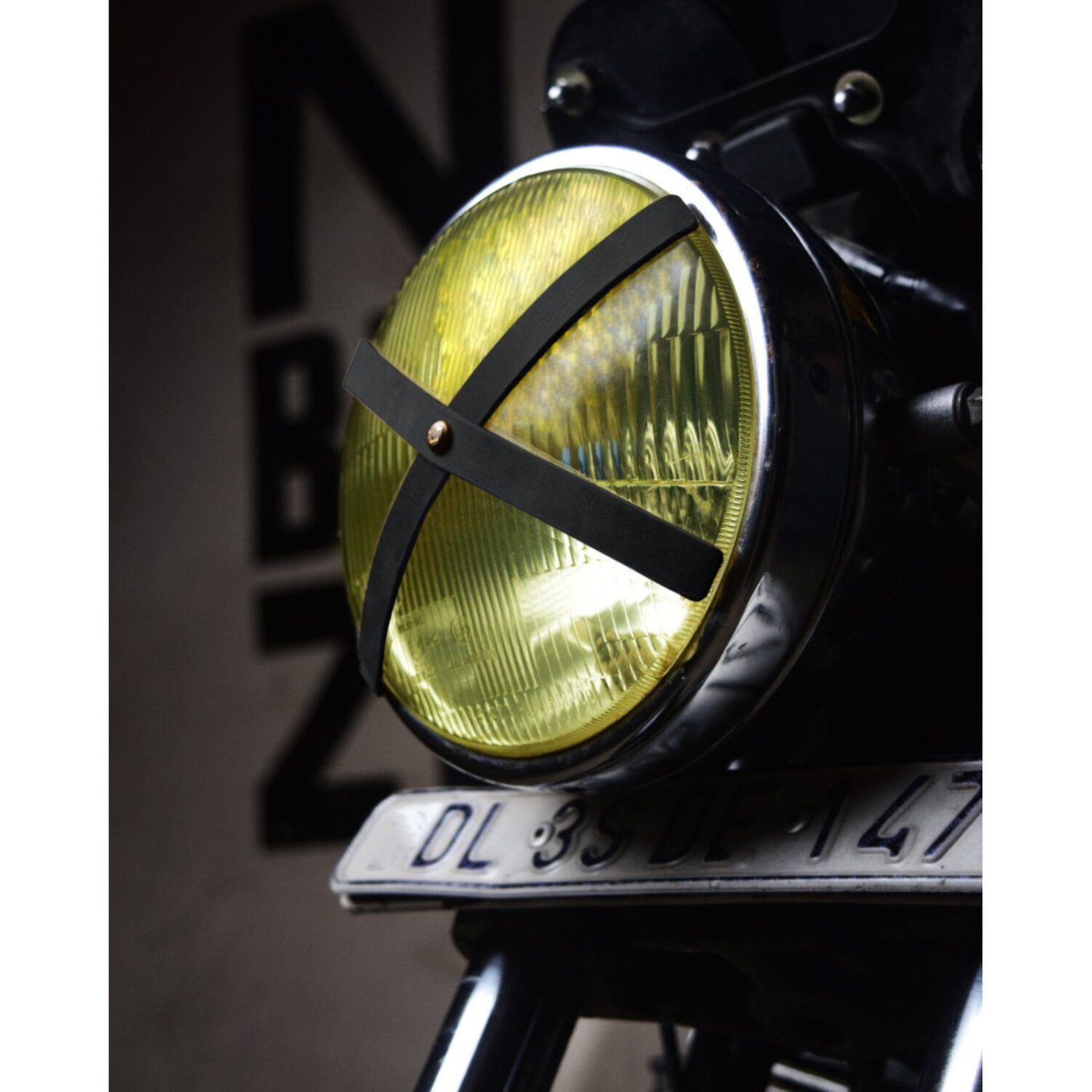 The Trip Machine headlamp X tape is an ode to the British café racer style and rocker sub culture. It was used on track days to prevent the headlight glass from shattering all over the circuit when the bike was crashed. This trademark X tape is a throwback to those good old days of motorcycling ánd a tribute to the racers who influenced the café racer look. Finished in leather or perforated leather, it oozes character and rocker lifestyle. The leather sticks to your headlight glass / polycarbonate with heavy-duty tape from 3M. Installation is a simple peel & stick. – Maximum headlamp diameter 19cm (7.5″).