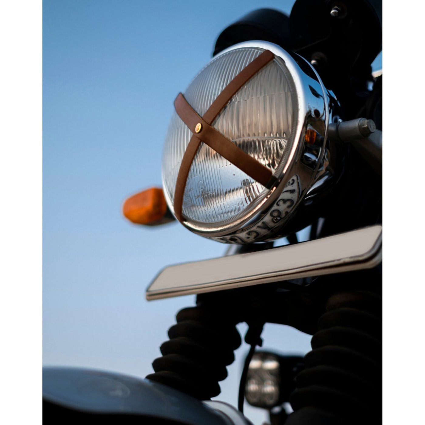 The Trip Machine headlamp X tape is an ode to the British café racer style and rocker sub culture. It was used on track days to prevent the headlight glass from shattering all over the circuit when the bike was crashed. This trademark X tape is a throwback to those good old days of motorcycling ánd a tribute to the racers who influenced the café racer look. Finished in leather or perforated leather, it oozes character and rocker lifestyle. The leather sticks to your headlight glass / polycarbonate with heavy-duty tape from 3M. Installation is a simple peel & stick. – Maximum headlamp diameter 19cm (7.5″).