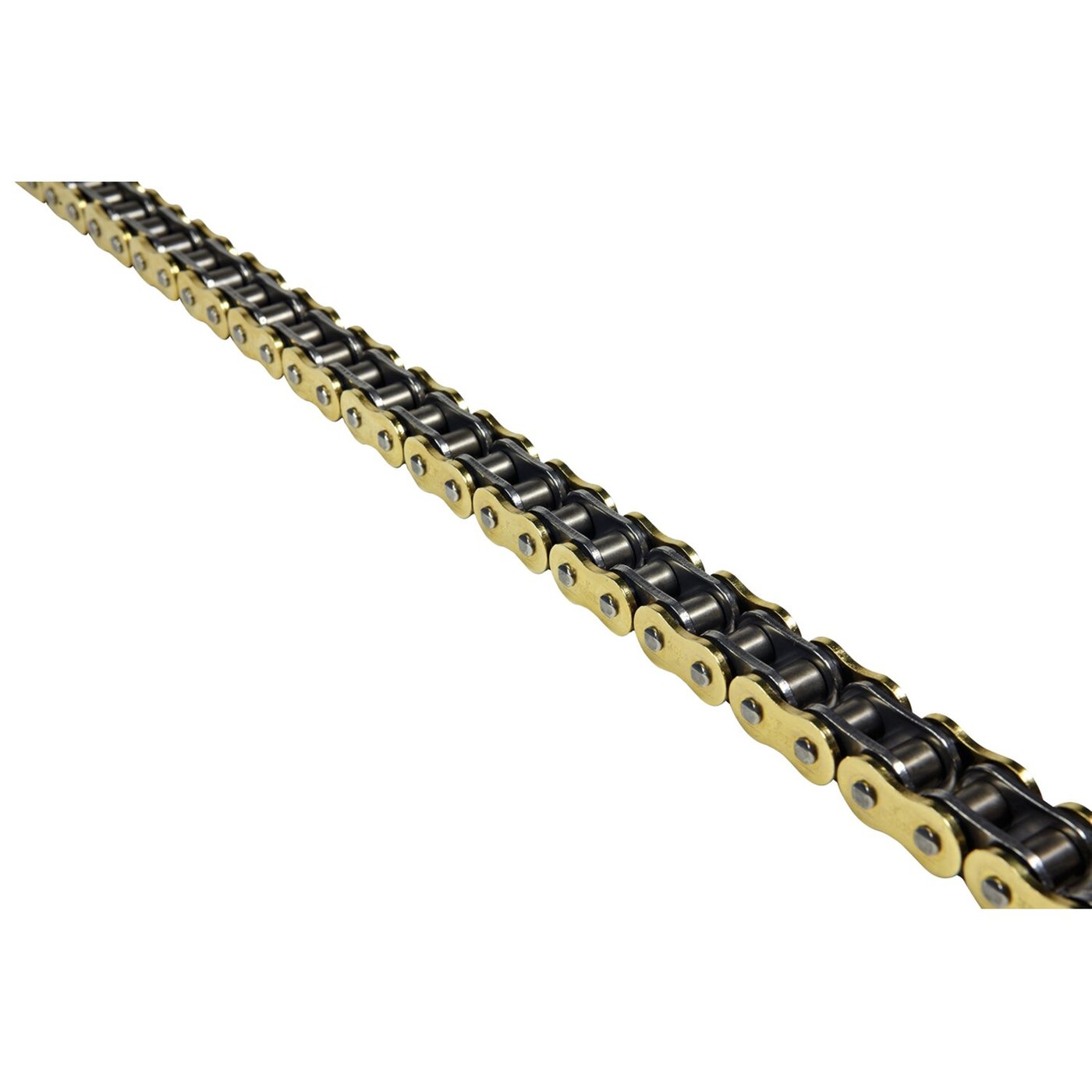For over 150HP applications. Gold colored chain. Comes with hollow rivet link for easy installation with industry standard tools. The X-ring is a very thin ‘O-ring’ with an X shape which offers a drag reduction on rollers and side plates. Reduction in drag is such that efficiency is almost increased to the same level as a regular roller chain, with the longevity of a regular O-ring. This is the quality Tsubaki chain which combines superior strength and performance with the longevity well known to O-ring type chains. Average tensile strength 45.1 kN. – Gold colored link plates – Low friction ‘X-ring’ seal ring – For over 150 HP bikes. Note: These chains come with a pin link (rivet style) master link. A clip style connecting link (506143 RQ1) must be ordered separately if desired.