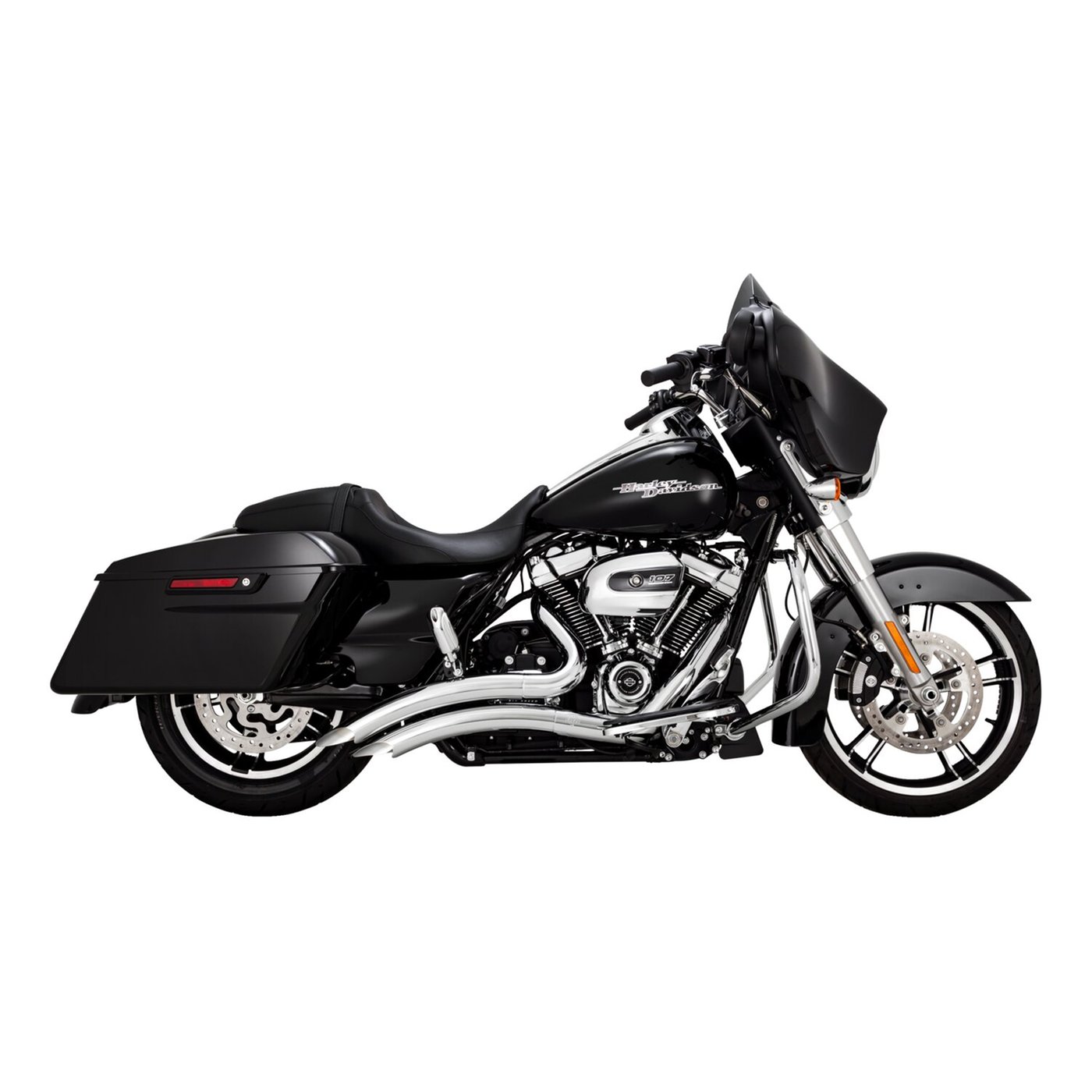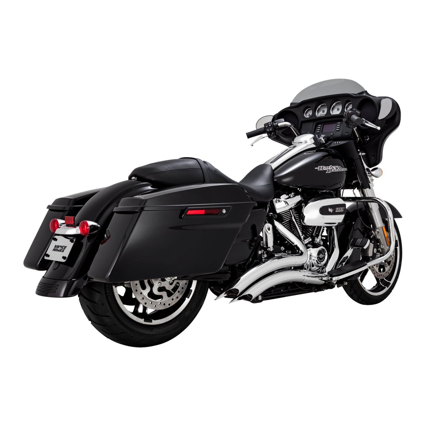 Delivering the best of both worlds, radical custom-bike styling with high quality details, Big Radius reset the bar for aftermarket exhaust systems. Comes with full coverage 2-1/2″ diameter plasma cut heat shields that preserve the ‘new’ look and will virtually eliminate visible blueing. Now featuring our innovative PCX™ Technology, which integrates chambered high-flow catalysts for a boost in torque while producing the deep throaty growl you want from your V-Twin machine. – PCX™ (Power Chamber Exhaust) technology – Chambered high-flow catalyst cartridge cesigned to increase torque – Full coverage heat shields. Vance & Hines innovative PCX™ Technology: More Power & Less Heat. The PCX™ (Power Chamber Exhaust) Technology are factually chambered high-flow catalysts. Used to increase mid-range torque for more responsive acceleration off the line. They are positioned downstream for up to 20% less heat at the floorboards / foot pegs and 50% less heat at the collector, to optimize rider comfort over the stock system. Tech-Tip: Pre-2021 USA mufflers on a 2021-up EU Softail/Touring? 21-up US models, have just 2 O2 sensors in the headers. 21-up EU models (Euro 5 system) have total 3 or 4 O2 sensors, also 1 or 2 downstream in the muffler(s) or in the balance pipe of the cross-over section. Therefore 21-up US exhaust systems will not fit 21-up EU models. The FuelPak FP4 (part number 942227) allows you to disable the 2nd. downstream O2 sensor, without triggering trouble codes. This will enable you to use US or pre-2021 EU exhaust mufflers that are not equipped with a downstream O2 sensor connection.