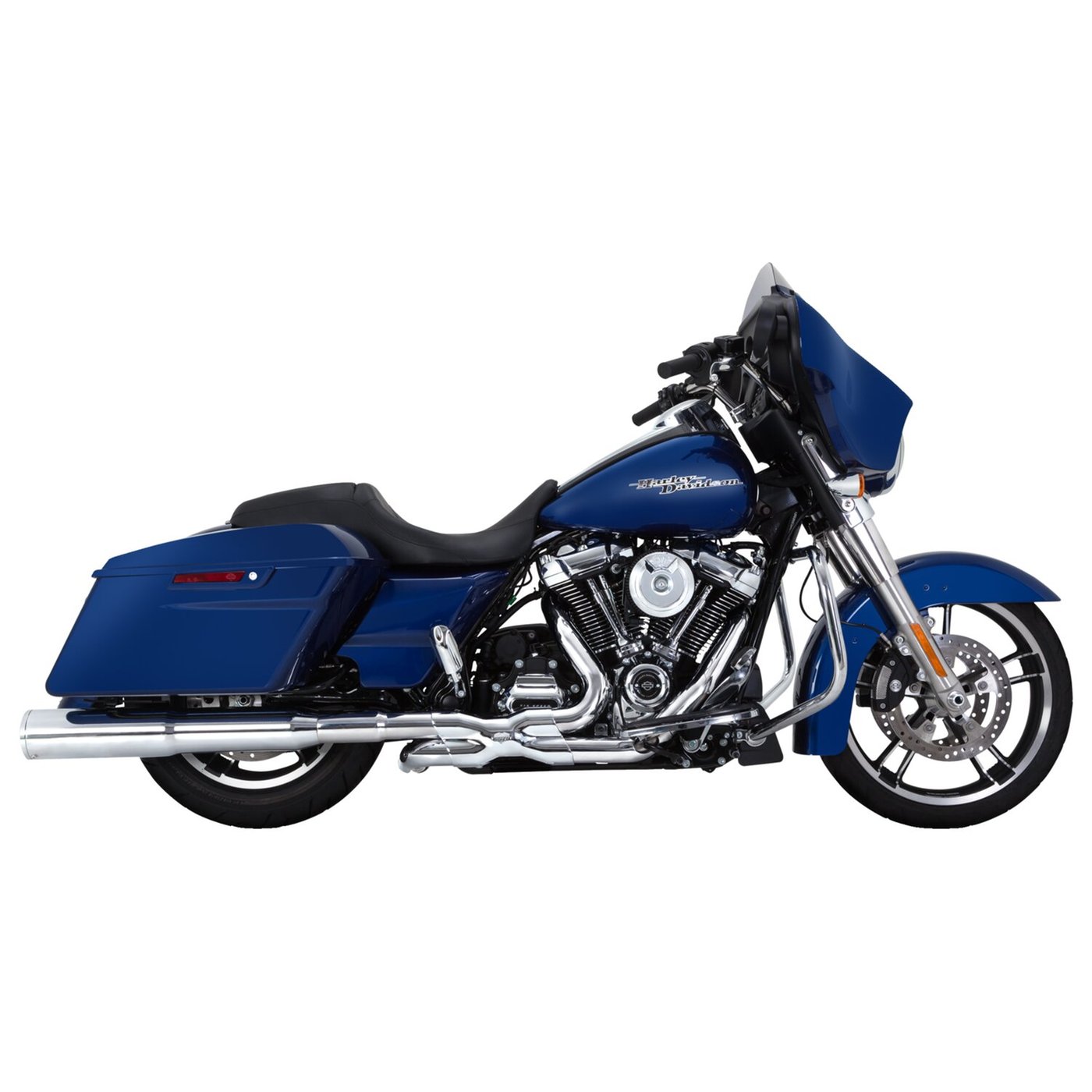 Often imitated, never duplicated. Power Duals header pipes are the standard for high style performance on late model baggers with the contoured collector shield, crowned with the iconic Vance & Hines V-Twin crest. The Vance & Hines innovative PCX™ Technology, which are equipped with chambered high-flow catalysts combined with stepped headers, to increase mid-range torque for more responsive acceleration off the line/out of corners and is positioned downstream to optimize rider comfort. Power Duals are a perfect match with all Vance & Hines Touring slip-on mufflers. – PCX™ (Power Chamber Exhaust) technology – Chambered high-flow catalyst cartridge designed to increase torque – Catalysts repositioned downstream for rider comfort – Full coverage heat shields – Chrome plated finish – 49-State emissions compliant. Vance & Hines innovative PCX™ Technology explained: More Power & Less Heat. The PCX™ (Power Chamber Exhaust) Technology are factually chambered high-flow catalysts. Used to increase mid-range torque for more responsive acceleration off the line. They are positioned downstream for up to 20% less heat at the floorboards / foot pegs and 50% less heat at the collector, to optimize rider comfort over the stock system. PCX™ technology uses a high-flow double-matrix catalyst that improves torque delivery through the mid-range for more responsive acceleration. All while producing an even deeper full-throated rumble, all with no compromise to the styling of any Vance & Hines exhaust system. Tech tip: Pre-2021 USA crossovers on a 2021-up EU Touring? The FuelPak FP4 (part number 942227) allows you to disable the 2nd. downstream O2 sensor, without triggering trouble codes. This will enable you to use US or pre-2021 EU exhausts/mufflers that are not equipped with a downstream O2 sensor connection.