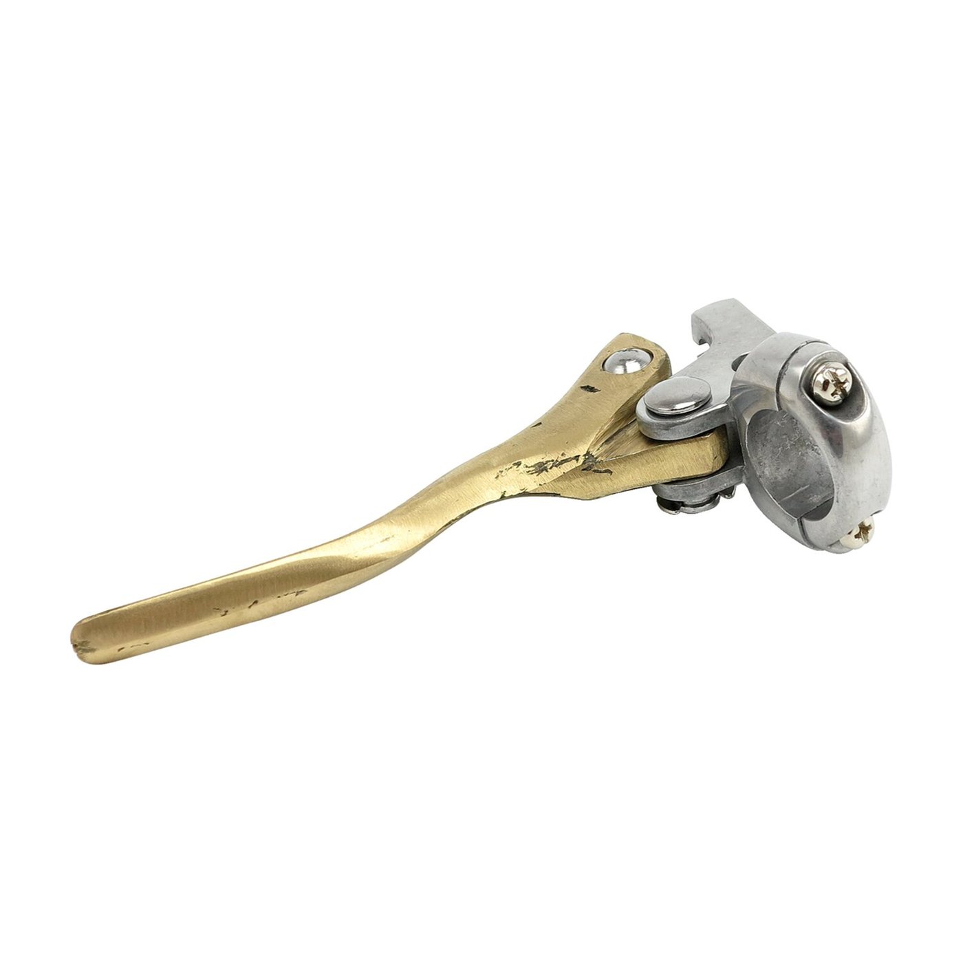 Aluminum with an old style brass lever. Semi un-polished stone washed cast finish. For 1″ diameter handlebars. 3/8″ medium brake cable hole. Small in-house productions make these sand-cast products true handmade pieces of art with a not-so-everyday-design ready to spark your imagination.