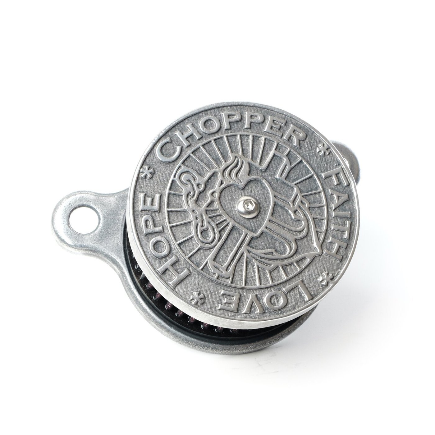 Aluminum. ‘Chopper-Faith-Love-Hope’. Sand-cast and in-house produced air cleaner in an un-polished ‘stone washed’ works finish. Ready to transport your bike to the sub-zero coolness dimension. Small production series warrant exclusivity. A true handmade Piece of Art.