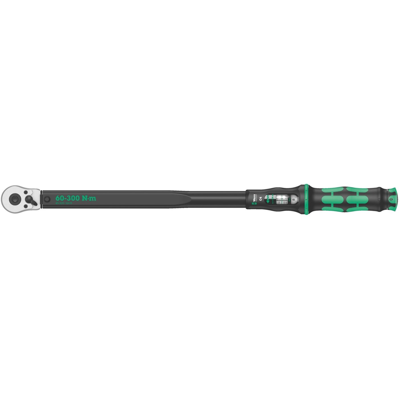 Robust 1/2″ drive torque wrench and a switch reversible ratcheting wrench in one, with pushbutton socket release. Torque control in clockwise direction only. When the pre-set torque value is reached you will both feel and hear it click. Torque readings in Nm and lbf. ft. Precision scale shows Nm only. Precision ± 3% of set value, as per DIN EN ISO 6789-1: 2017-07. Ratcheting direction is controlled by the flip of a switch, the 45 teeth ratchet design allows a 8° return angle. Comes with the Wera 2-component ergonomic Kraftform handle. Click-Torque C 4. 60-300 Nm (45-220 lbf. ft.). Overall length 595mm. Weight 1660 gram. Head width 43mm.