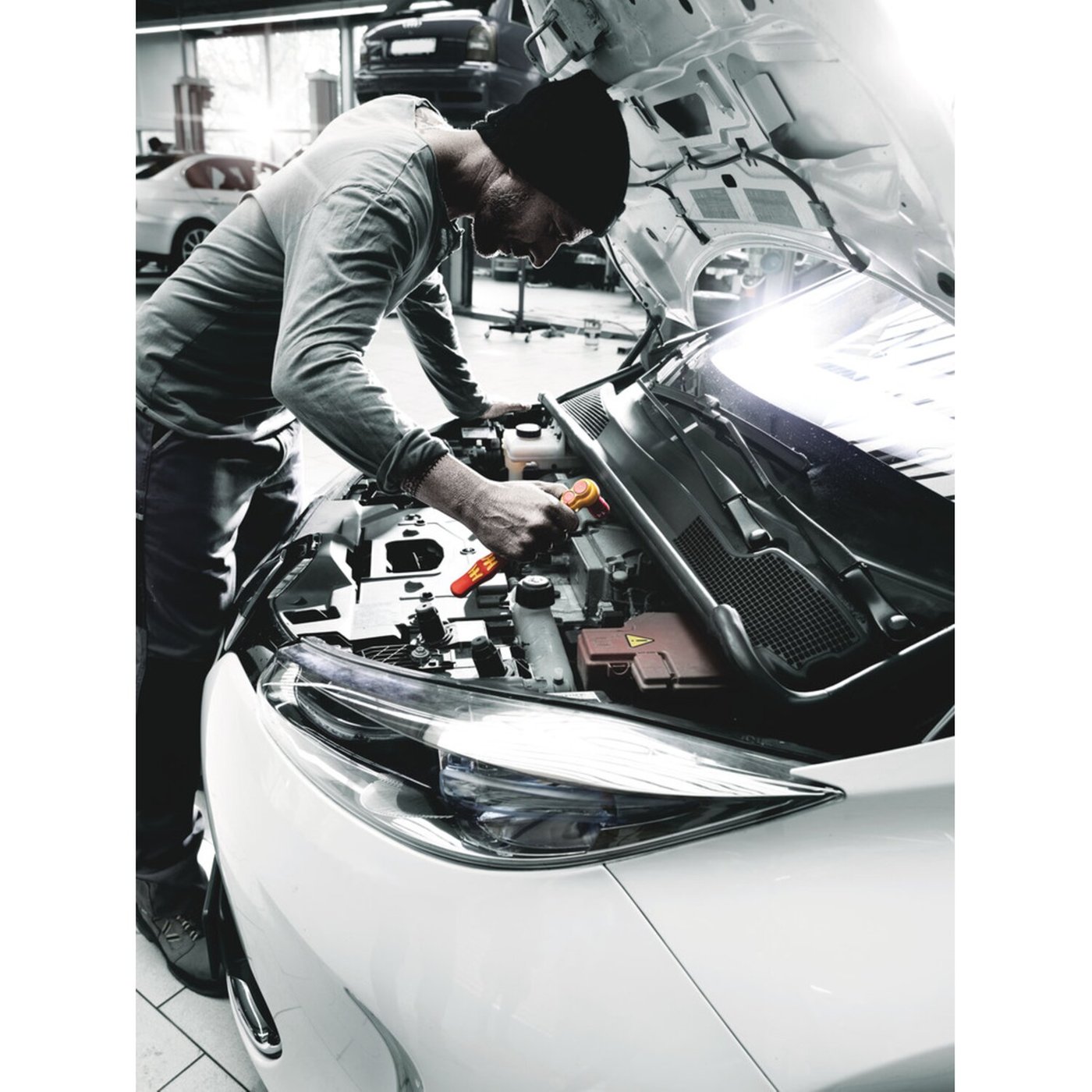 The insulated Zyklop VDE comes with a 3/8″ drive and a thumb-press button ball lock & release device. The extra slim ratchet head requires just 4.5″ return angle due to the 80 teeth design. Individually tested at 10.000 Volts. This is in accordance with IEC 60900, which ensures safe working with live wiring up to 1000 Volts. 222mm long