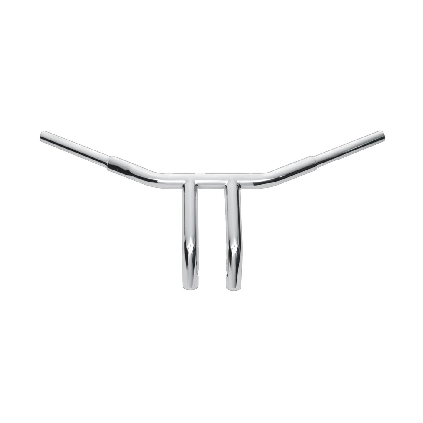 Chrome; Steel; Designed for ultimate fit on custom frames with additional rake & stretch and a great choice for people that require some additional pullback on stock rake bikes. Pre-drilled for internal wiring. Approx. dimensions: 30.5″ wide; 4″ rise; 8.5″ center width; 14.5″ pullback.
