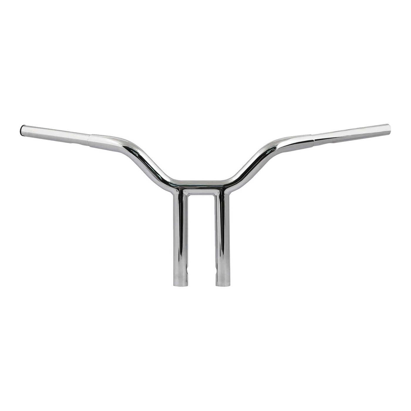 Chrome; Steel; Combination fusion of a Streetfighter and T-Bar with fluid bends for the best of both worlds. Approx. dimensions: 12″ rise (8″ risers & 4″ bar rise); 31.5″ wide